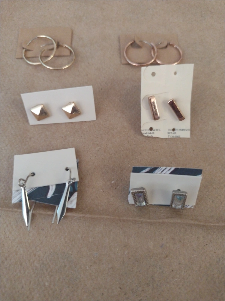 A set of 6 pairs of earrings, including gold hoops, gold studs, silver studs, and silver drop earrings.