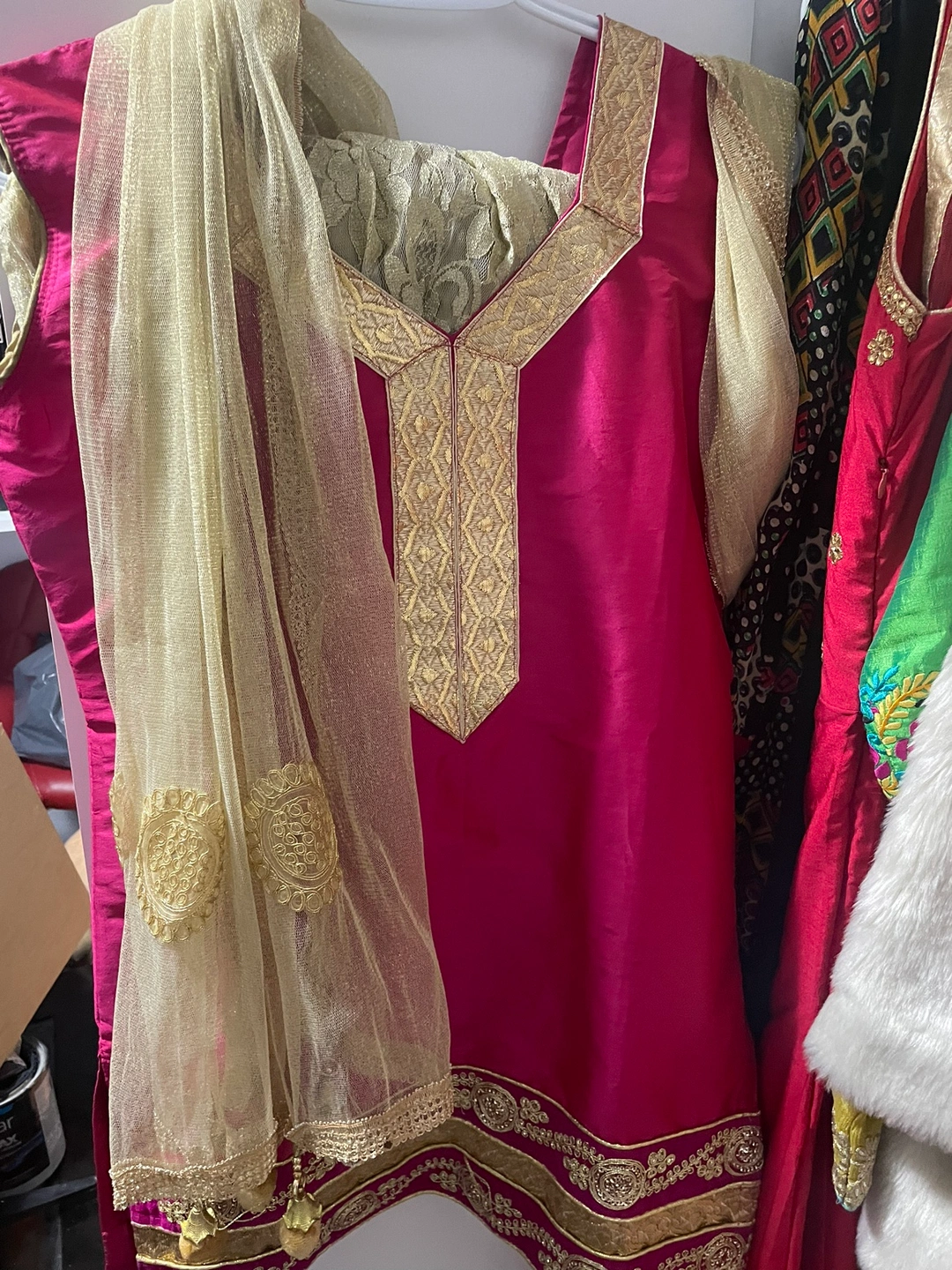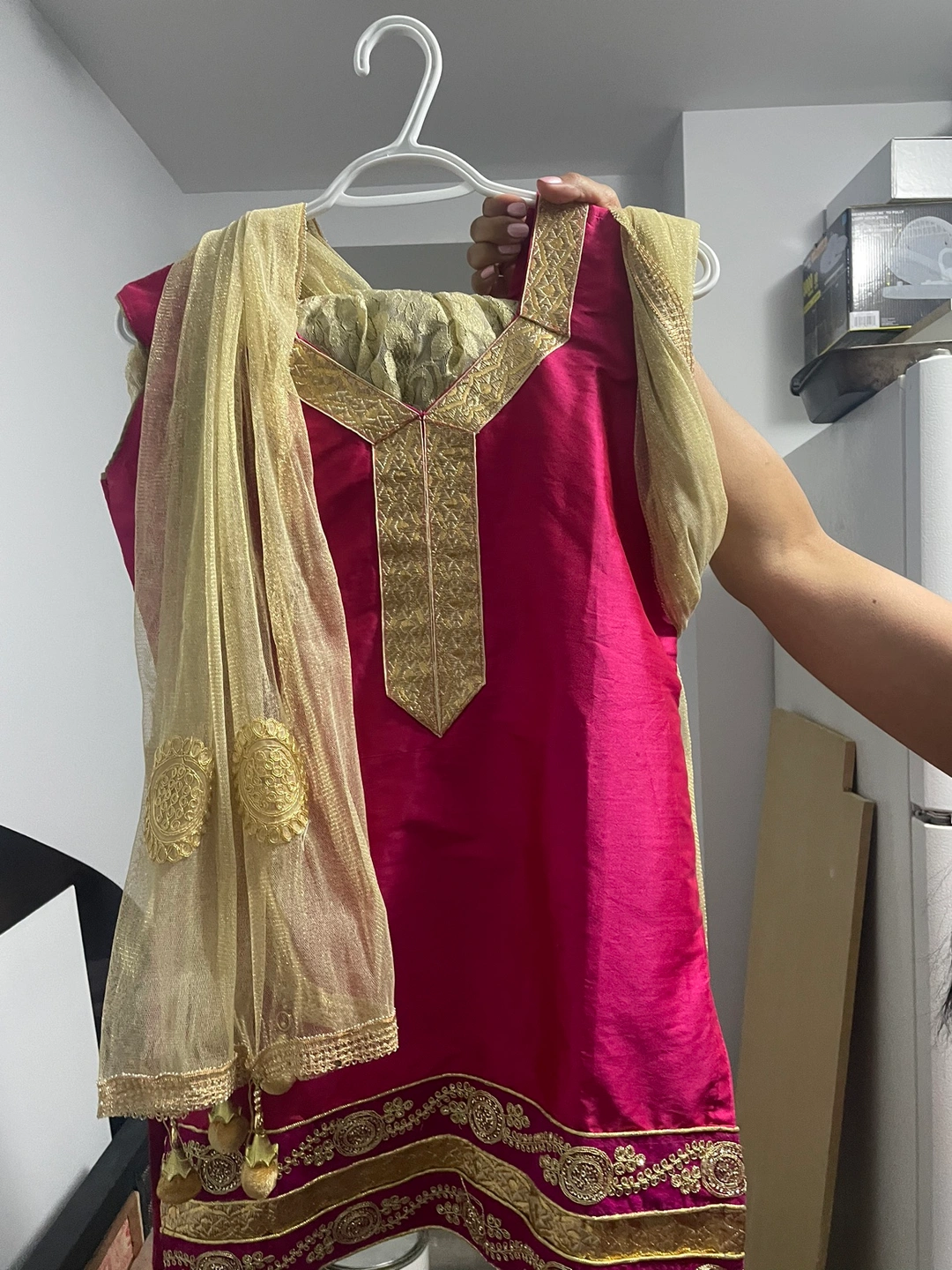 A beautiful pink sharara with gold embroidery and embellishments. Includes a matching gold dupatta. Sharara bottom is also gold.
