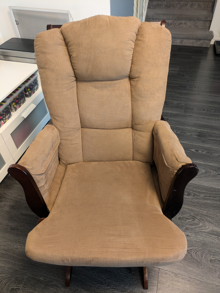 Beige glider rocker with matching ottoman. The chair and ottoman have a dark brown wood base. The chair has padded armrests and a high back. The chair and ottoman/foot rest are in good condition.