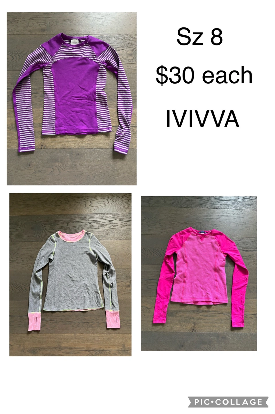 Ivivva by Lululemon long sleeve tops. Retail $75 each Selling for $30 each Pick up at Yonge and eglinton or Can meet on my way home at keele and eglinton, Royal York and eglinton, Sherway or Vaughan (major Mac and islington)