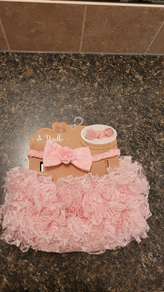 Pink headband with a flower and a pink lace diaper cover. The set is size 3-6 months.