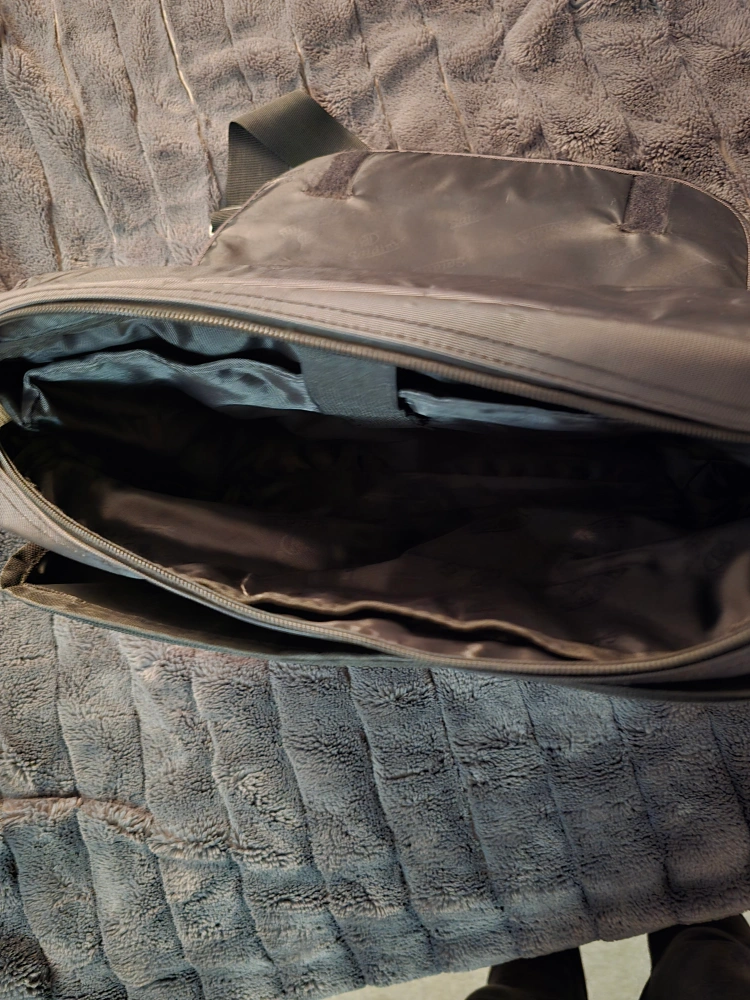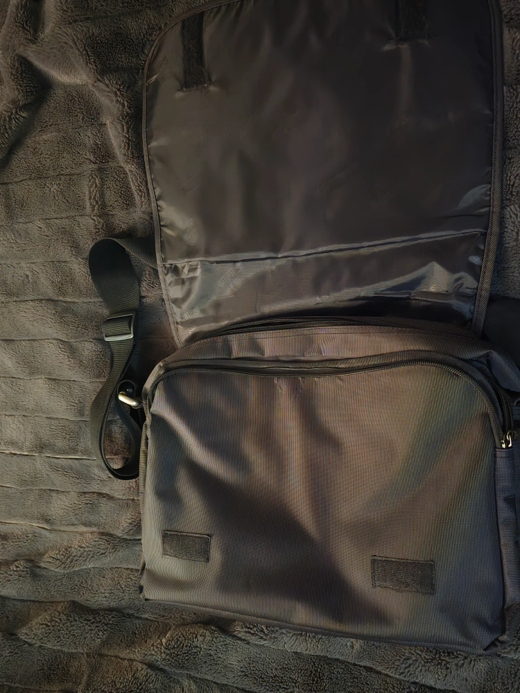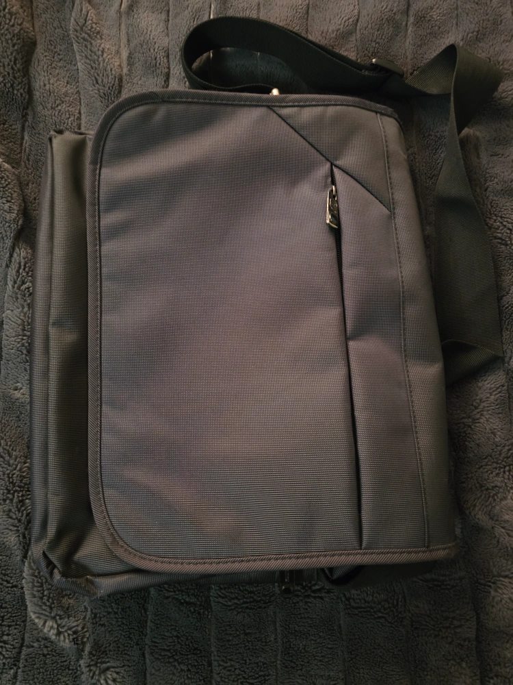 Black messenger bag with an adjustable strap. It features a zippered front pocket and a large main compartment. The bag is lined in a soft fabric.