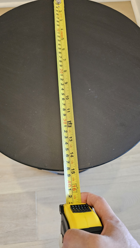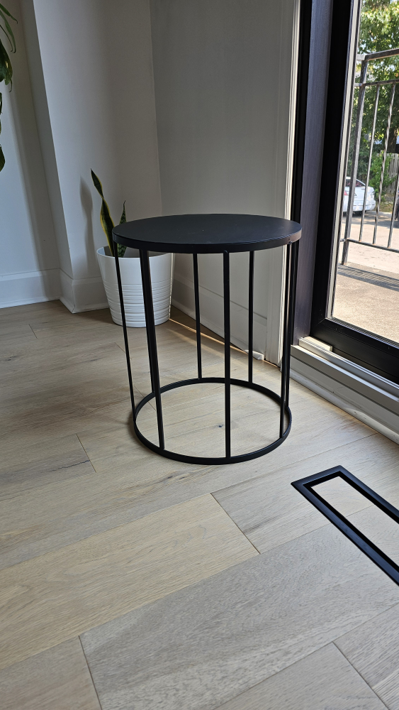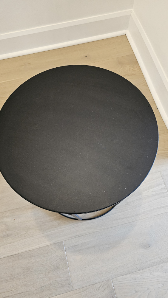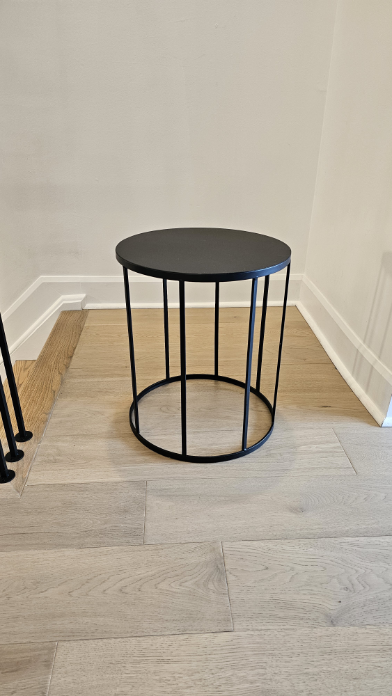 Black metal side table. Very light weight. Some light scratches. 15" x 18"