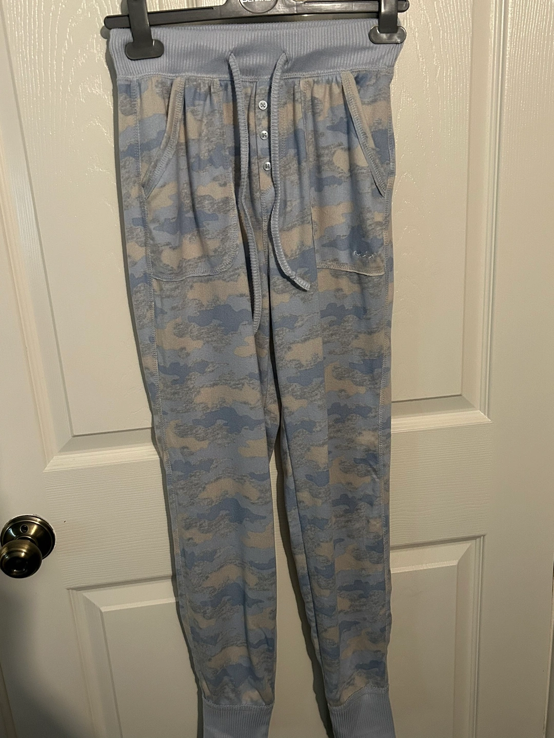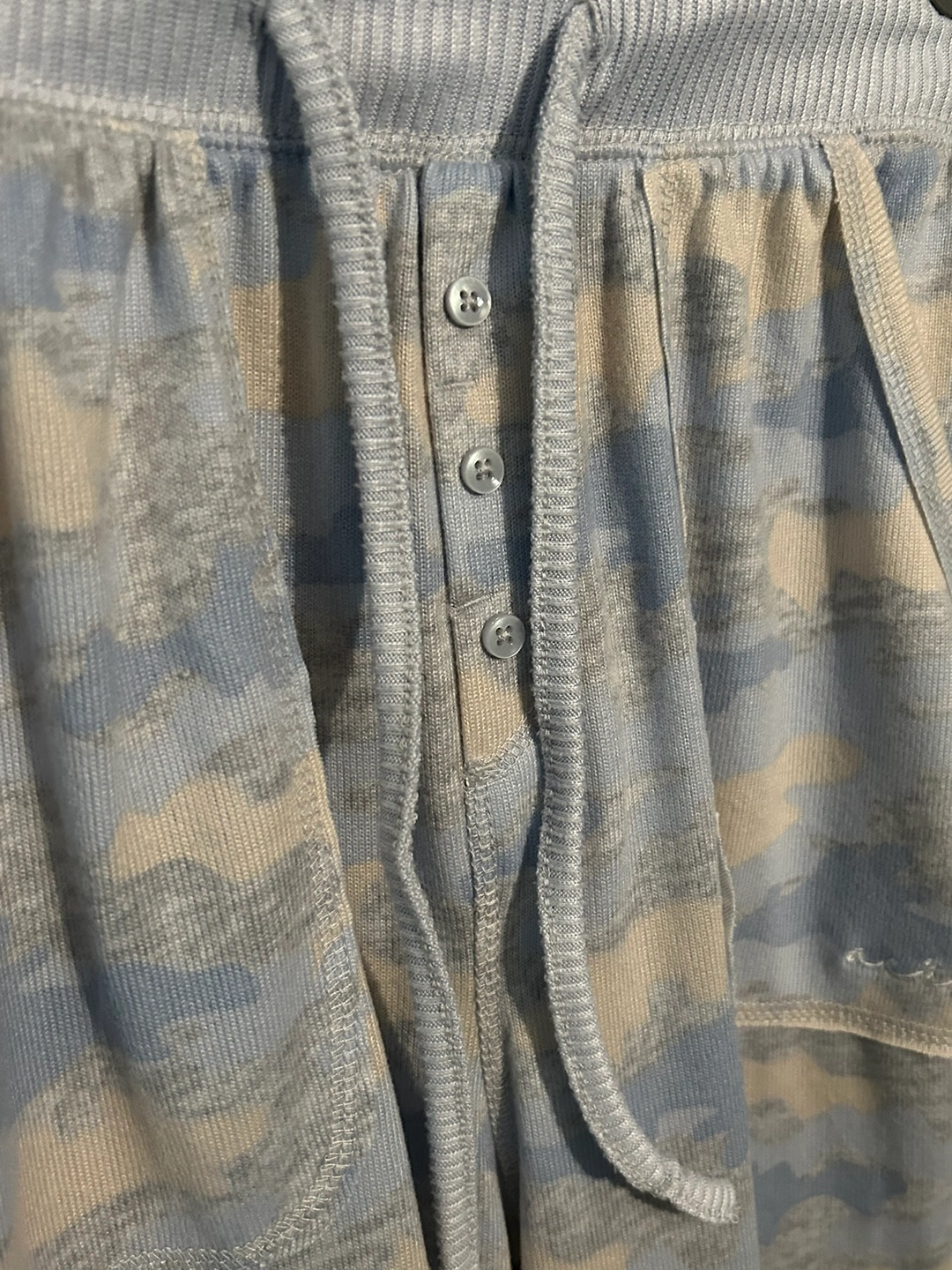 Blue camouflage pants with an elastic waistband and drawstring. They have two front pockets and a button fly. Brand new with tags paid 24.99 plus tax asking 12.50