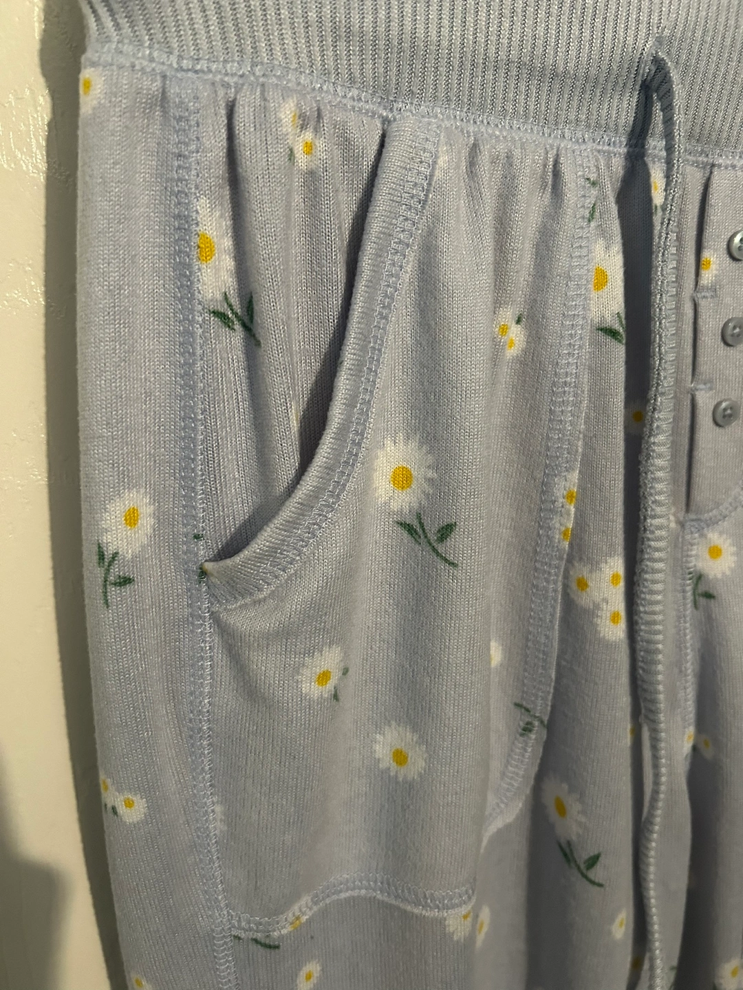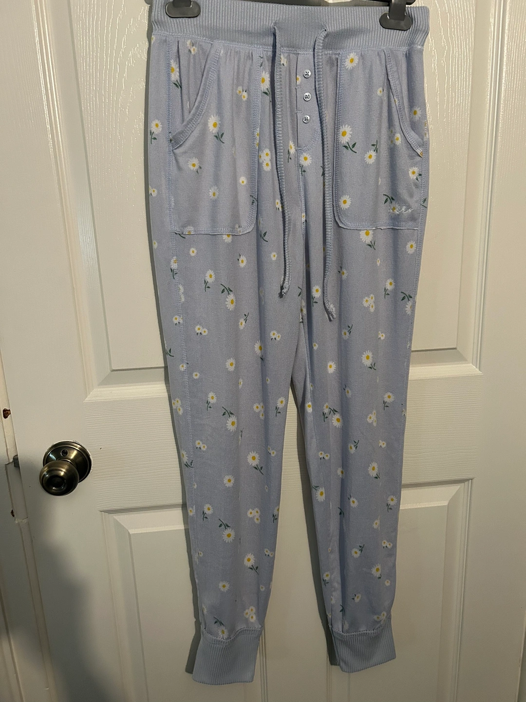 Light blue jogger pants with a white daisy print. Brand new paid 24.99 plus tax tag fell off Pick up Main Street and 16th Markham