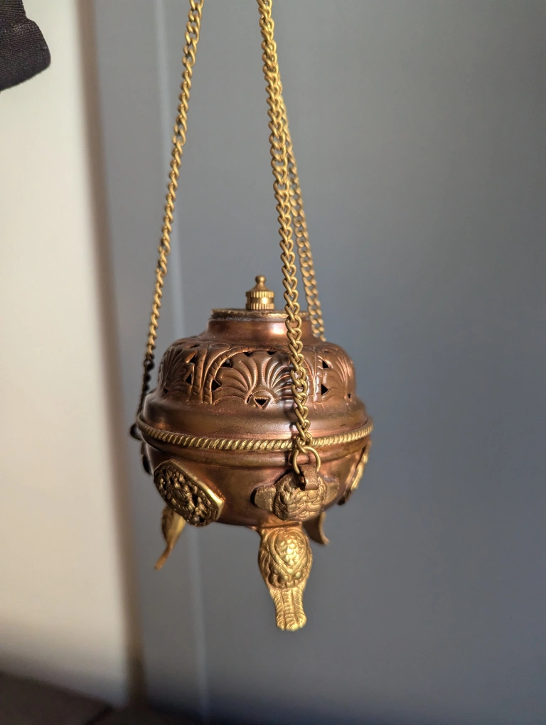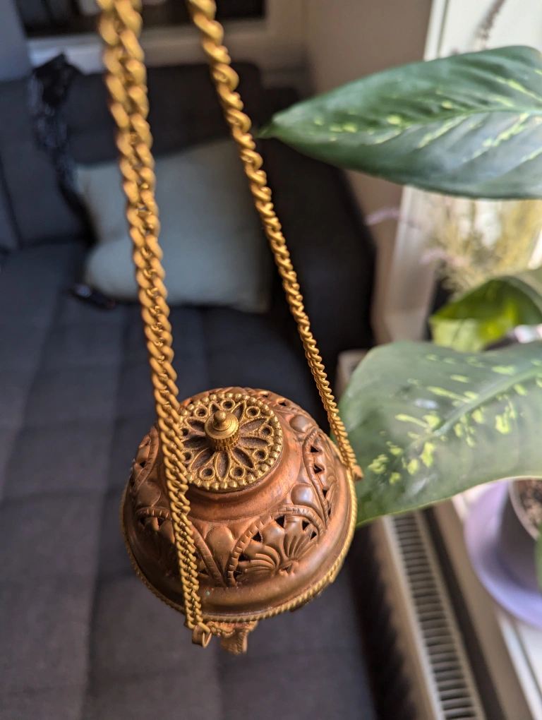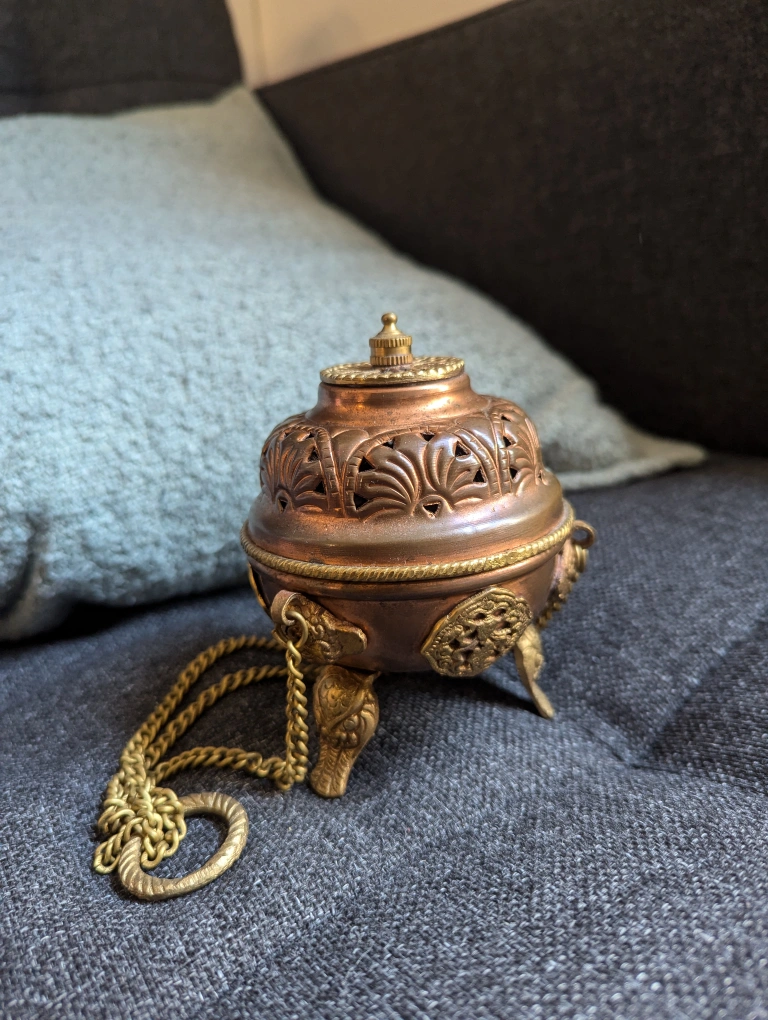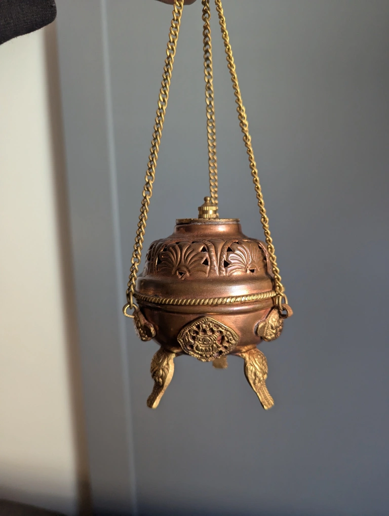 1000+a beautiful copper incense holder from Tibet It's made for burning resin, but it will also work with cones. I bought this four years ago but only used it a few times, so now it's just collecting dust. measures about 4" tall but when hanging it's 10.5" it's copper, so it could use a polish at this point! pick up by Keele and Humberside near Keele station