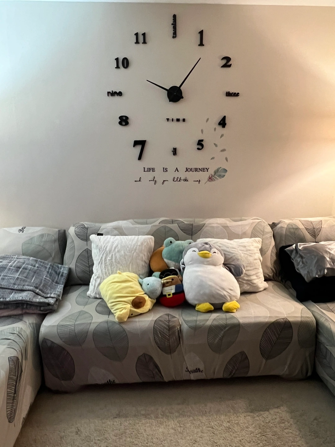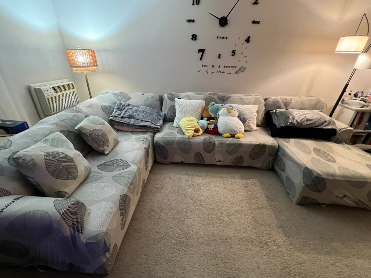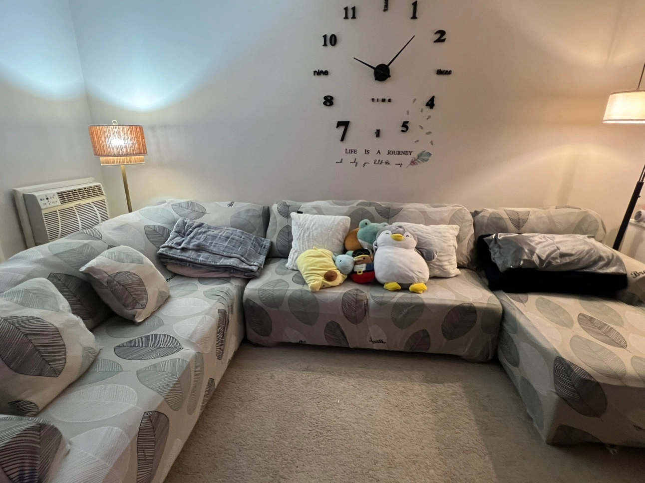 This sectional sofa is in good condition and is perfect for a living room or family room. It has a comfortable design with a variety of cushions. Can seat upto 7 people. Color dark grey. Free covers.