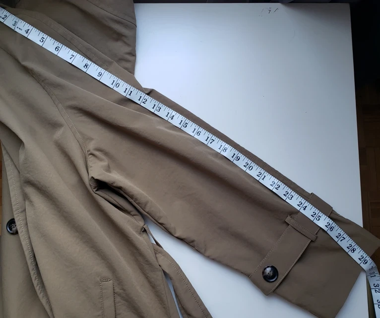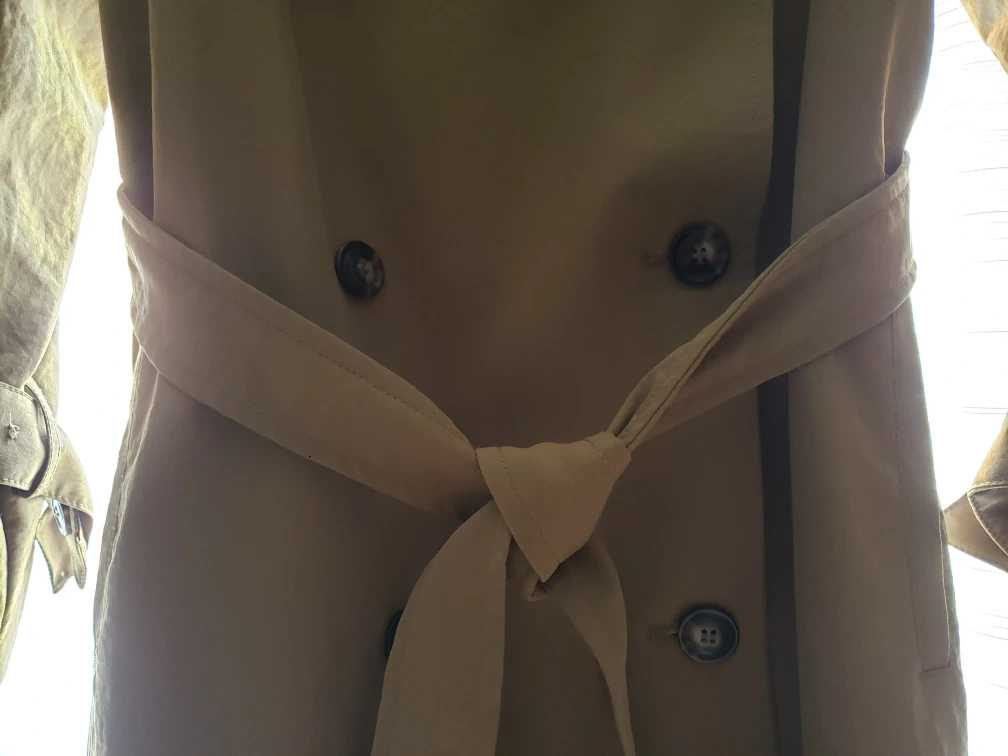 Notched lapels, buttons at front, welt front pockets, and a removable tie belt at waist. Long raglan sleeves and cuffs with adjustable tab and buttons. Vent at back. Lined.