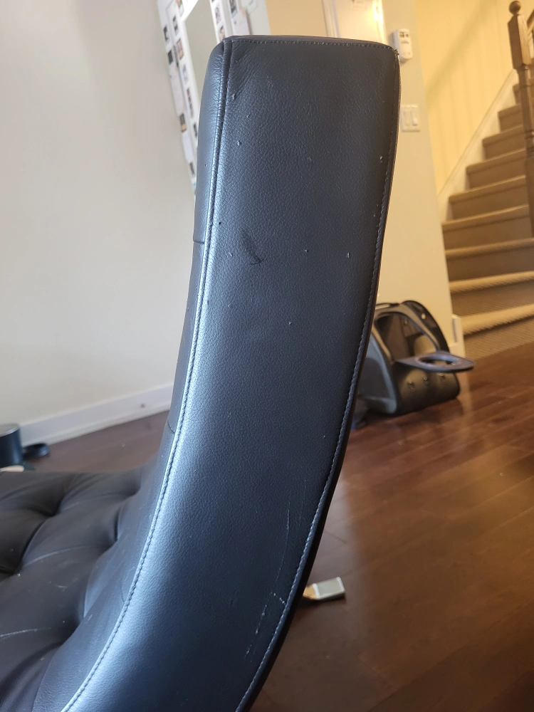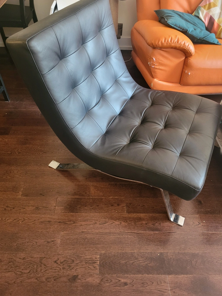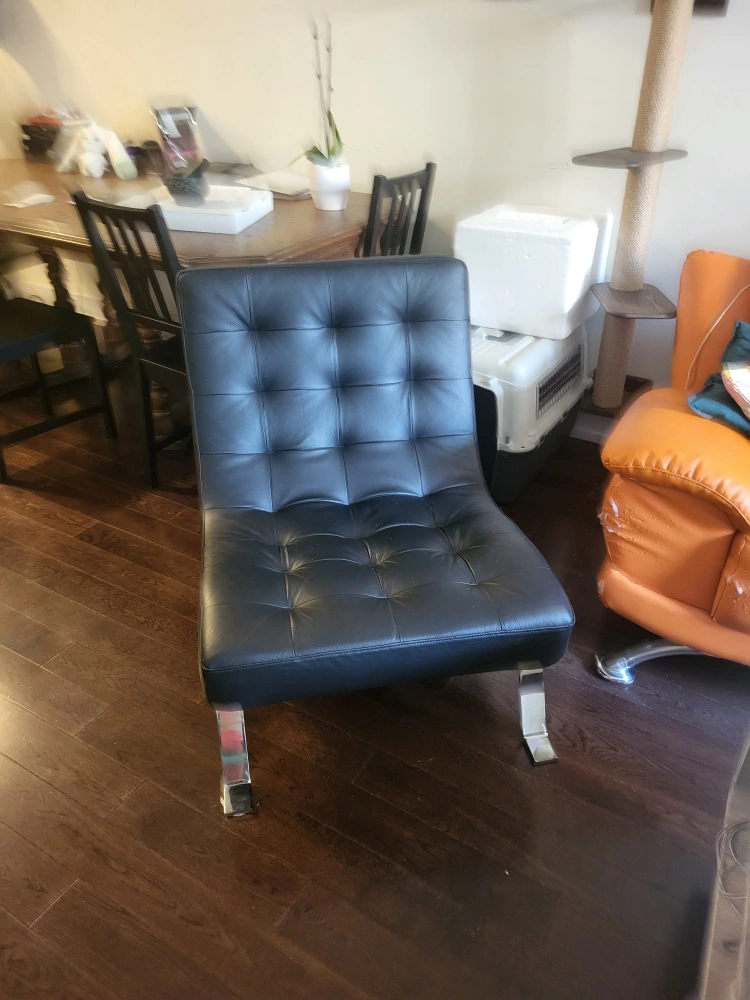 A black leather accent chair with chrome legs. The chair is in good condition, with some scuffing (see last photo). getting rid of it as we're downsizing