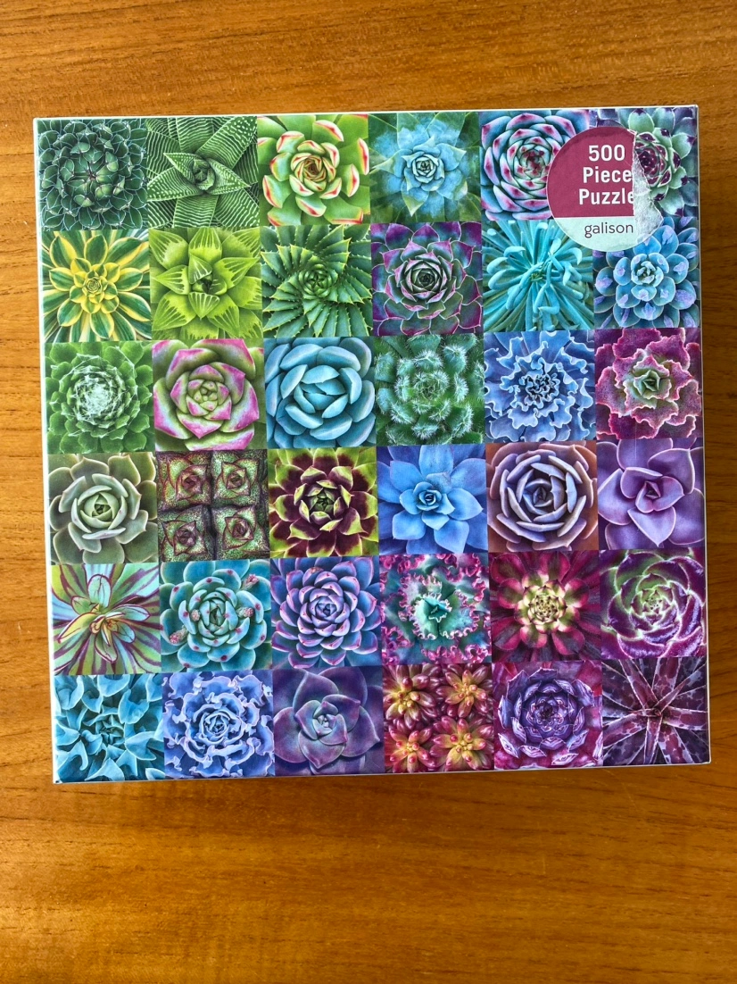 This is a beautiful 500 piece puzzle featuring succulents. Assembled once and in great condition. Wonderfully challenging! A great addition to any puzzle lover's collection.