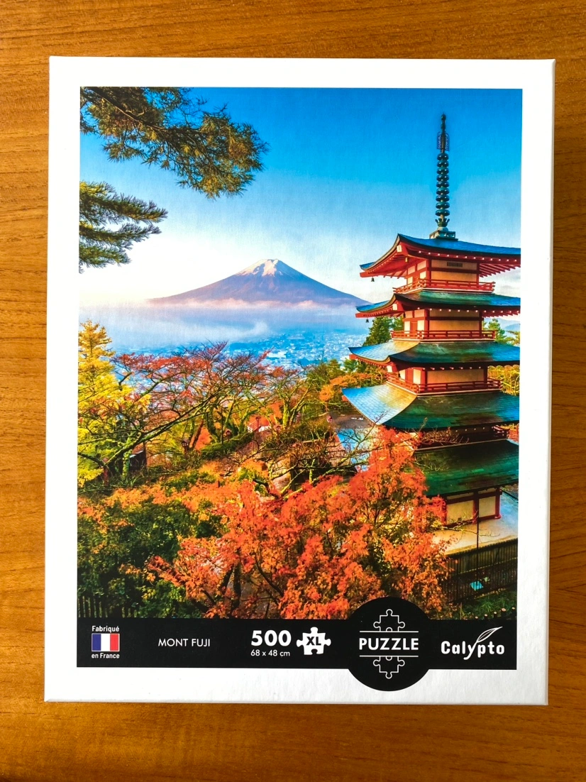 This is a 500-piece jigsaw puzzle featuring a beautiful image of Mount Fuji and a pagoda.