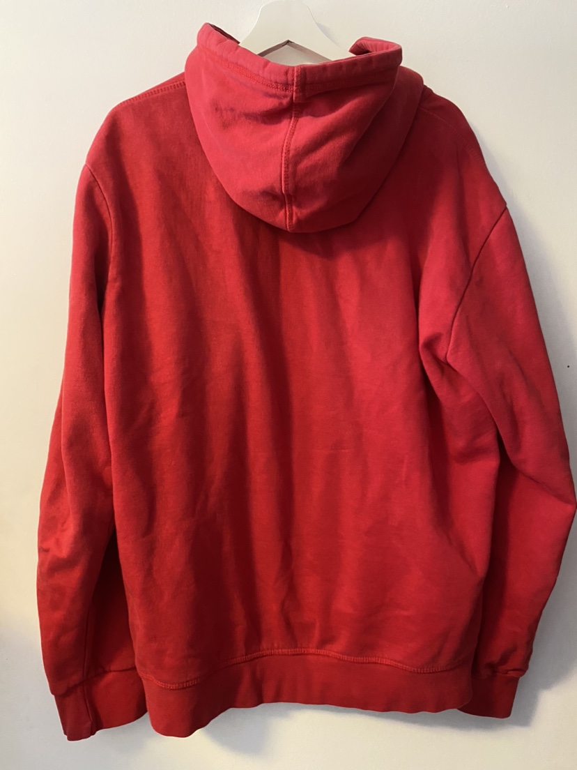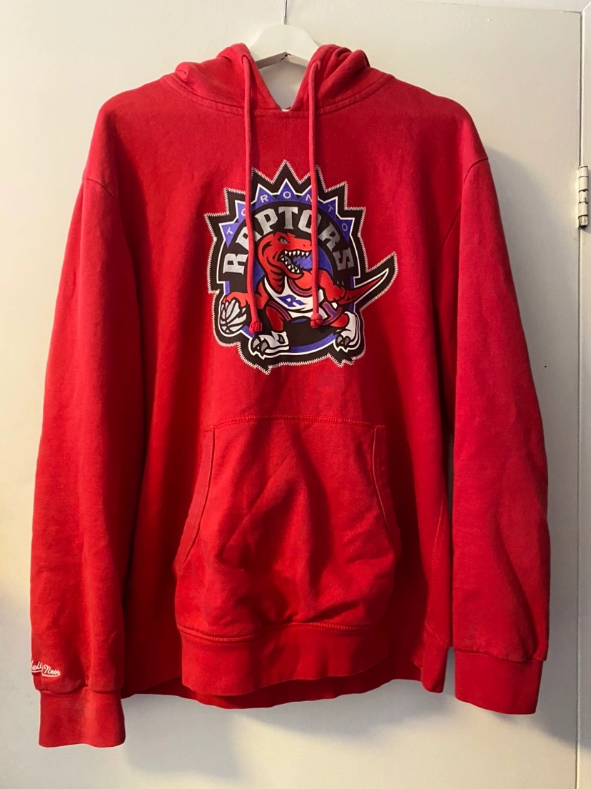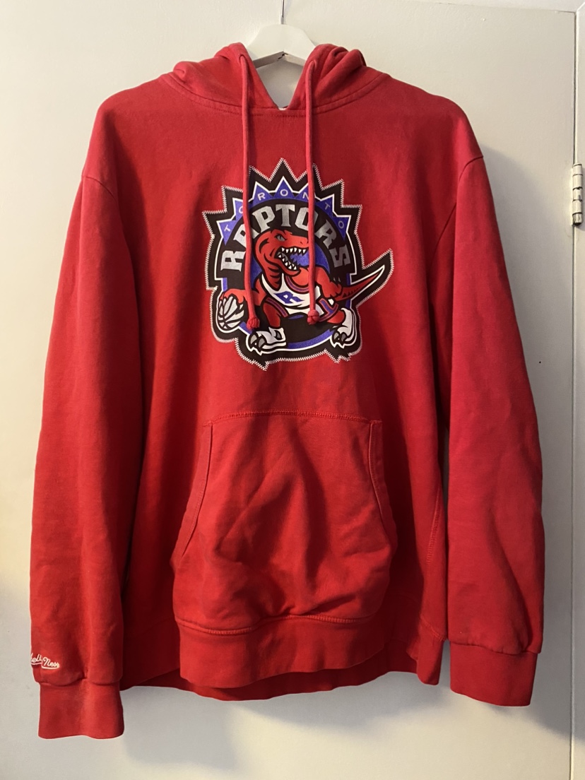 Red Toronto Raptors hoodie with a large team logo on the front. It has a front pocket and adjustable tie strings.