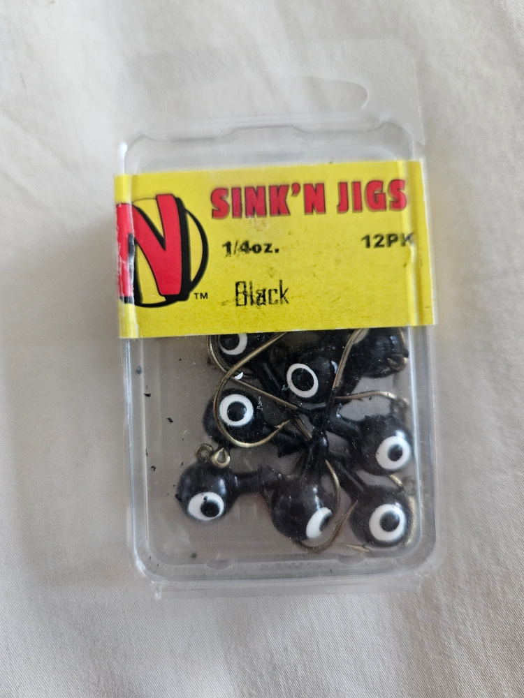 1000+1/4 oz. black fishing jigs with white eyes. 12 in package.