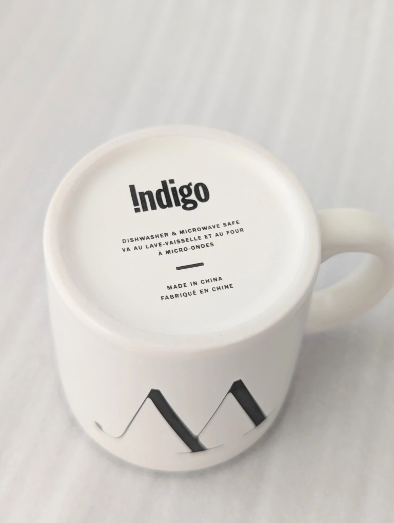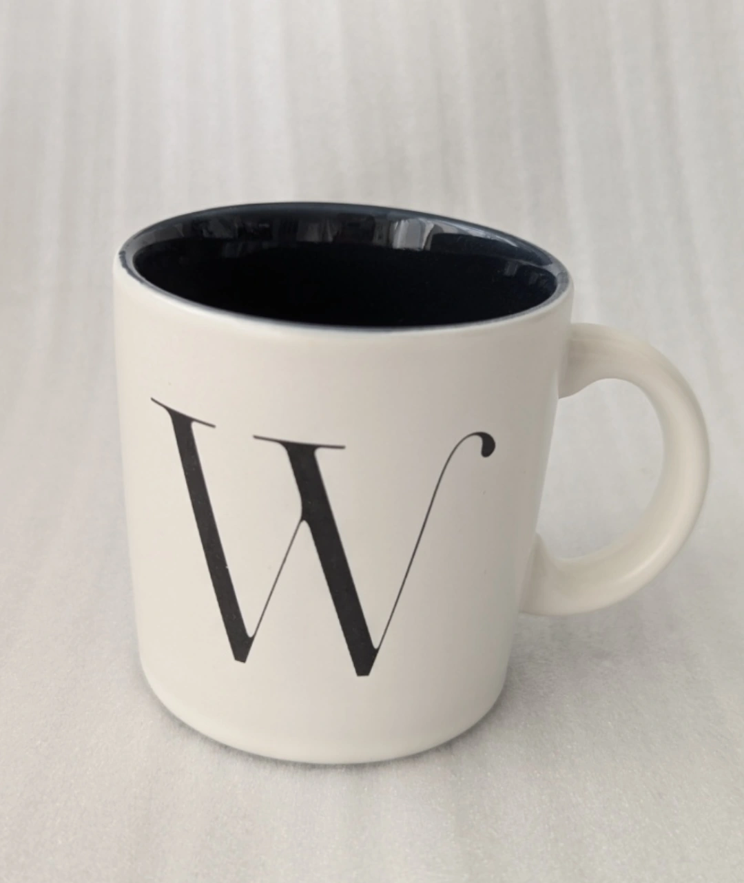 White mug with black letter "W" and dark blue interior. Microwave and dishwasher safe. Never used.