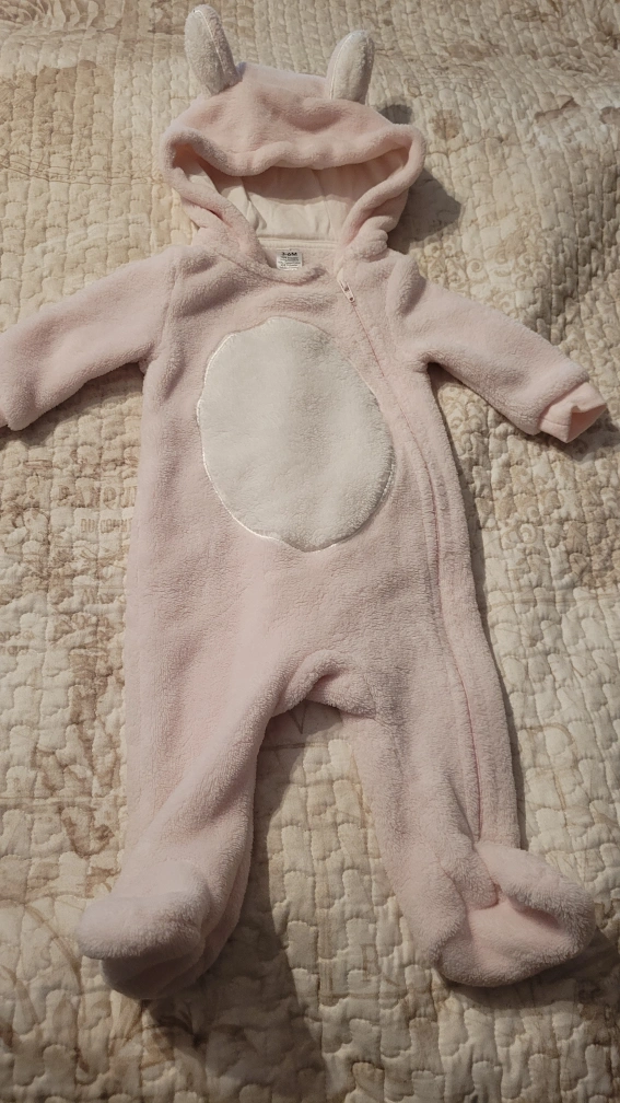Cute baby rabbit onesie with attached hood and ears. Zipper closure. Size 3-6 months.
