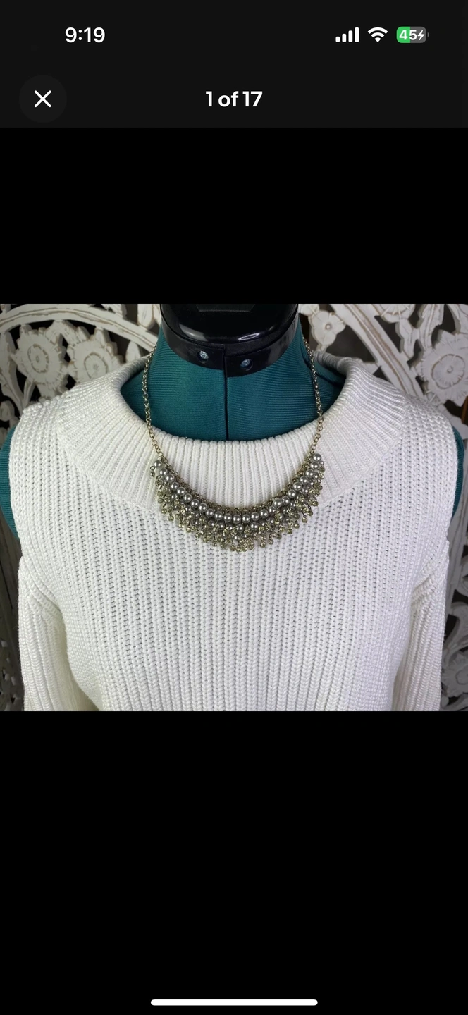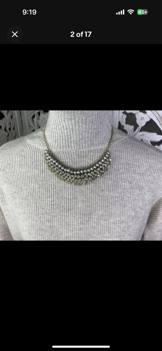 Loft Tiered Fan Bib Necklace Pewter Faux Pearl Crystals