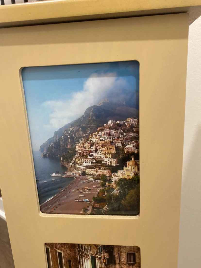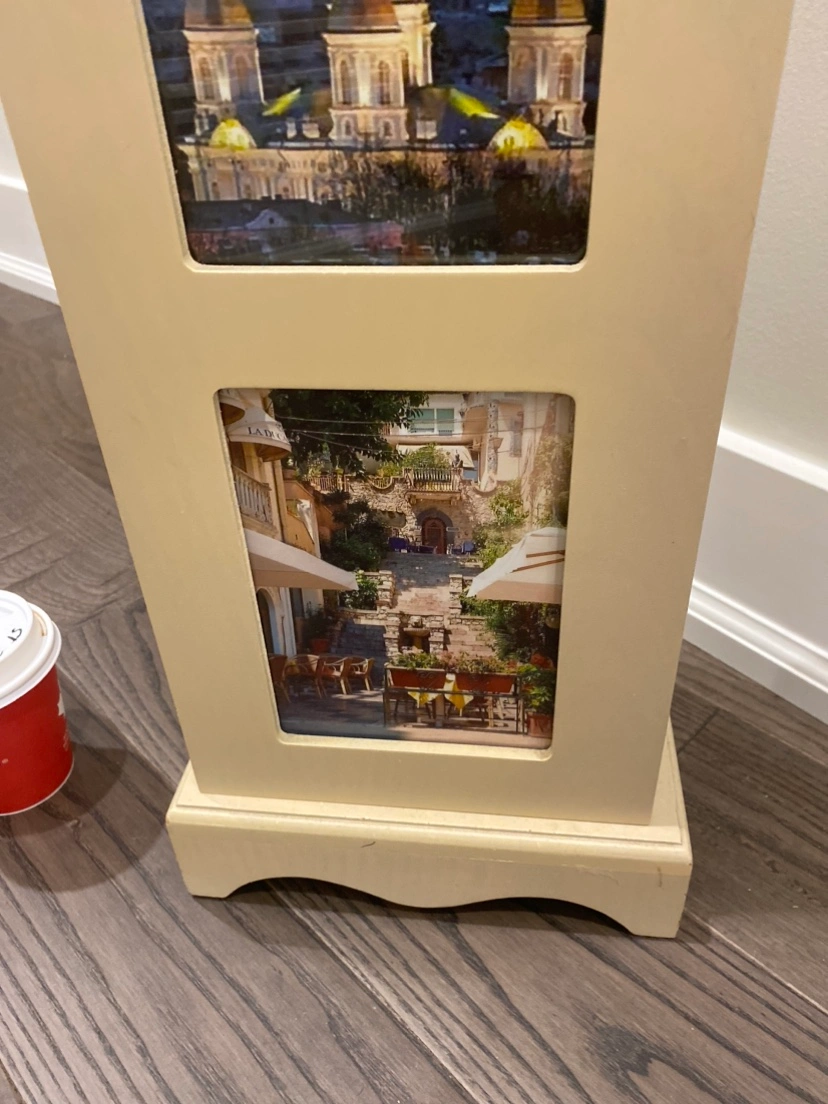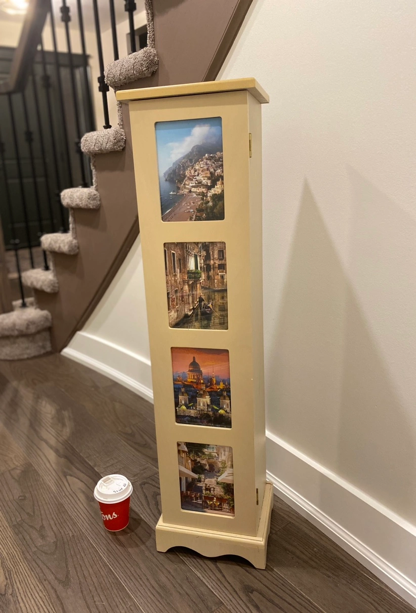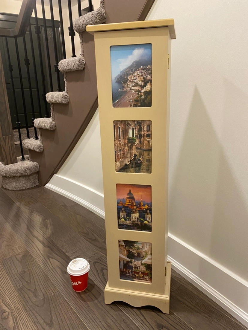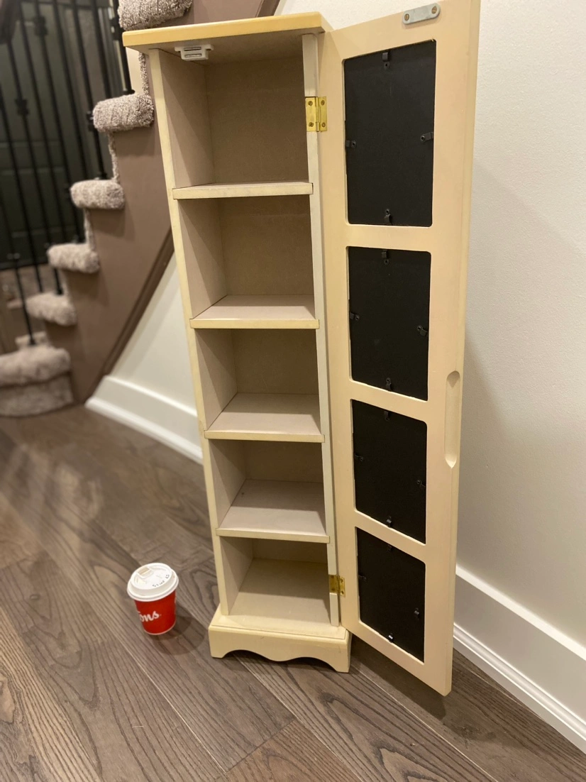 A tall storage cabinet with four glass photo frames on the front and a small cupboard door on the side. The cupboard has four shelves inside.
