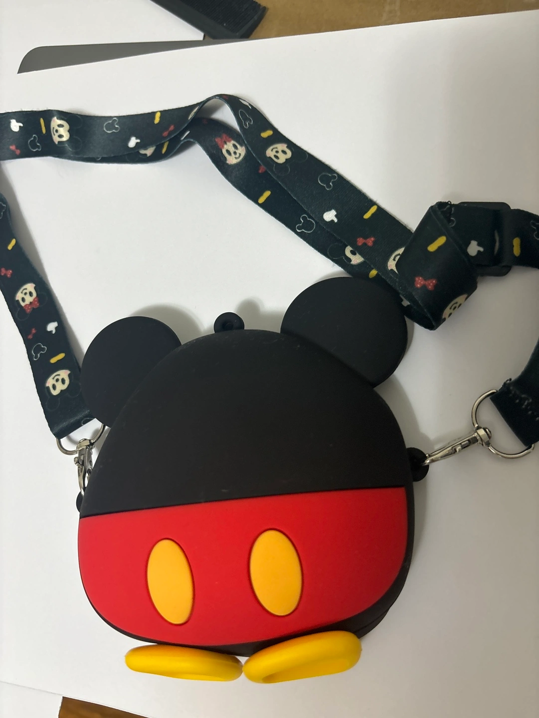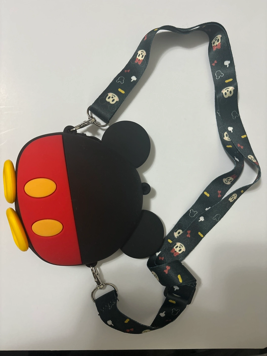 A small crossbody bag shaped like Mickey Mouse's head with a black strap with a Mickey Mouse print. The bag has a zip closure.