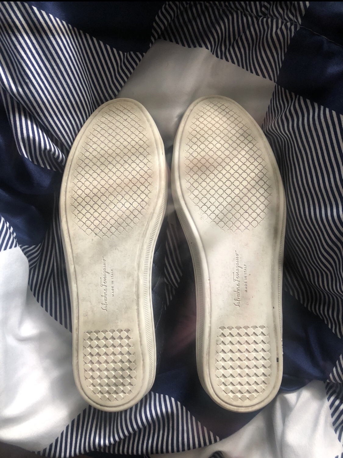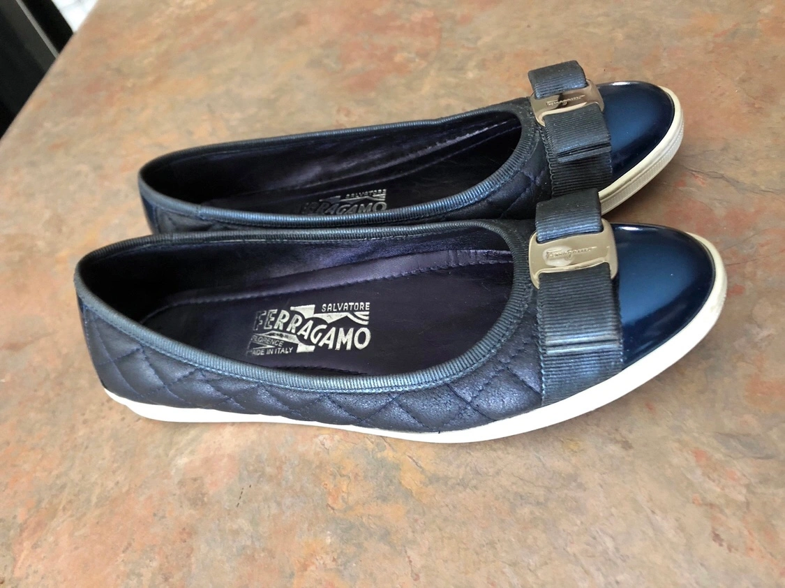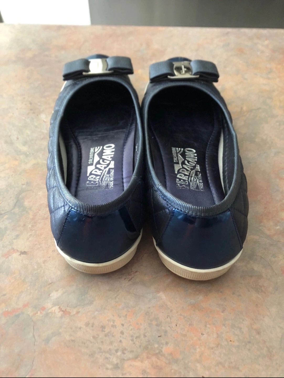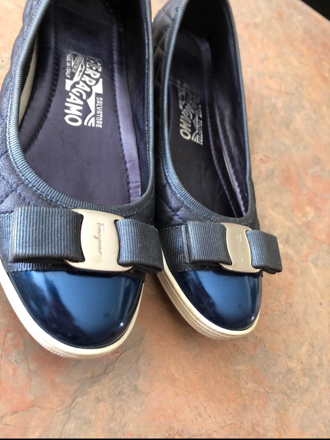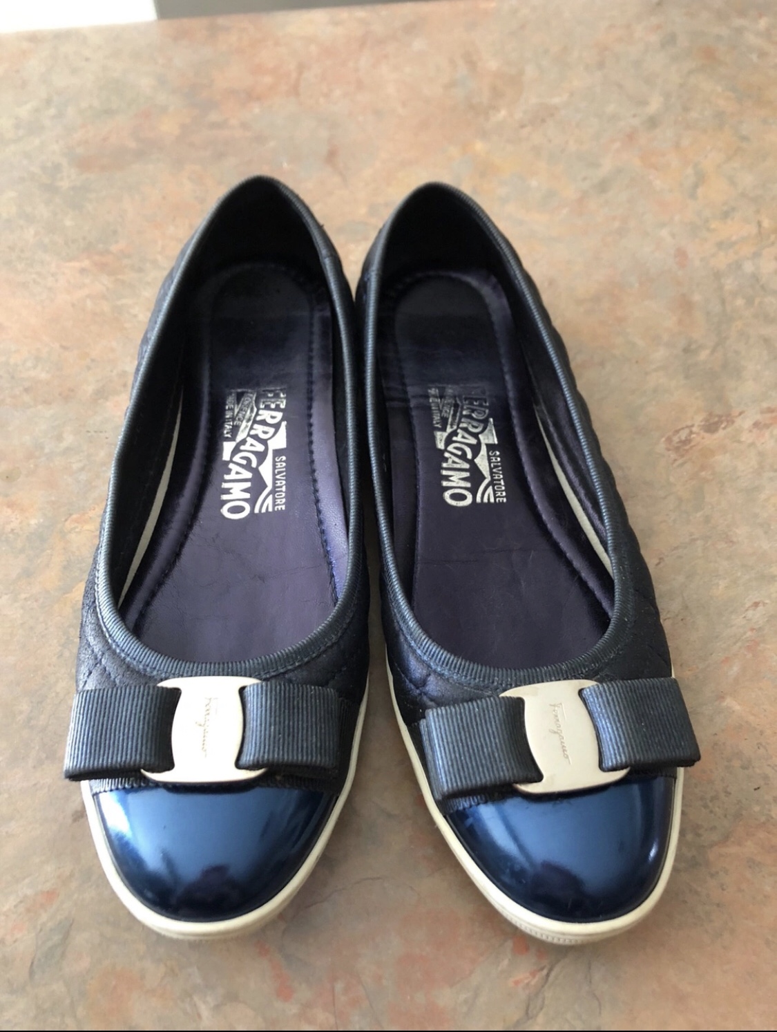 Authentic ferragamo ballet shoes/ flats. Blue quilted flats with a navy blue patent toe. The shoes are size 7.
