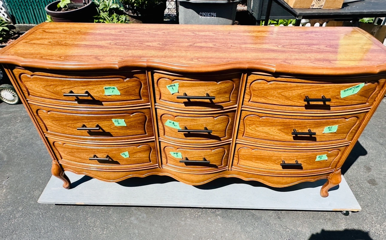 A beautiful dresser with six drawers, all with working hardware. This dresser has a rich wood finish and a curved front.
