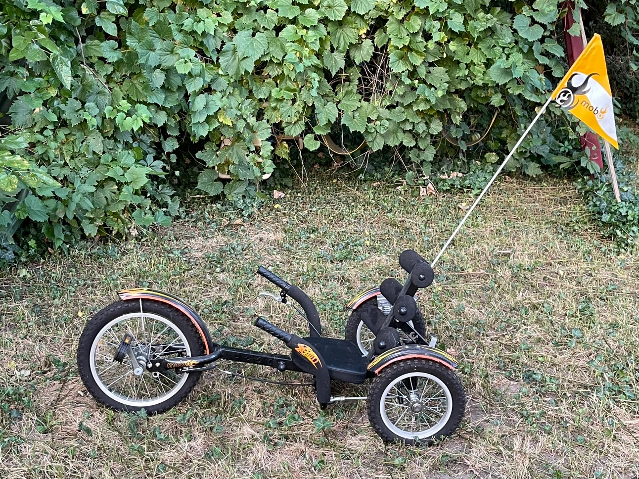 137Recumbent Bicycle and a Balance Buddy Trainer for learning to ride a bike. It includes a frame, a handle, and a flag. Recumbent $50 and trainer $10