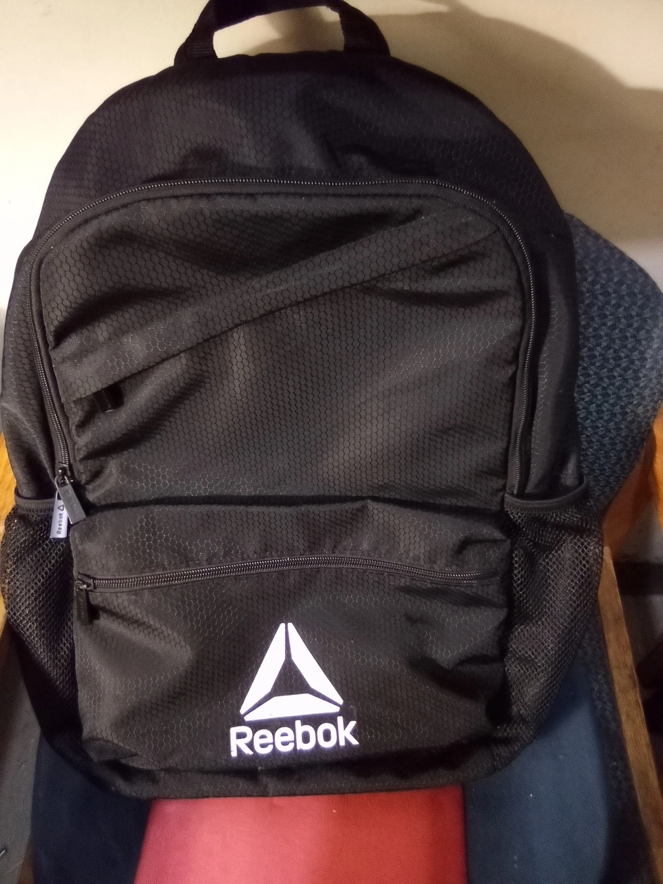 Black Reebok backpack with multiple pockets and a mesh side pocket. The logo is on the bottom of the backpack. The bag is in good condition.great for school and camping etc.👍✨☺️only available for pickup 🙂
