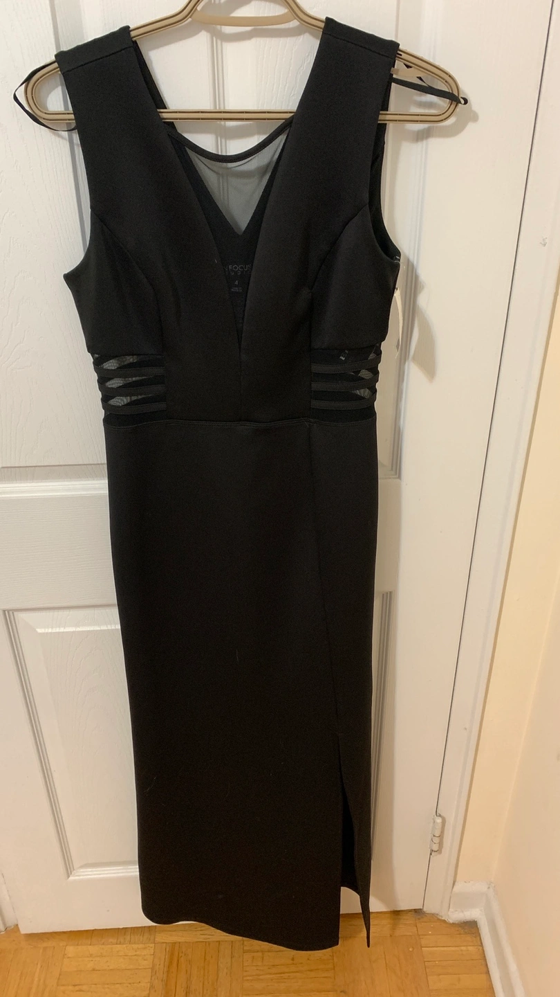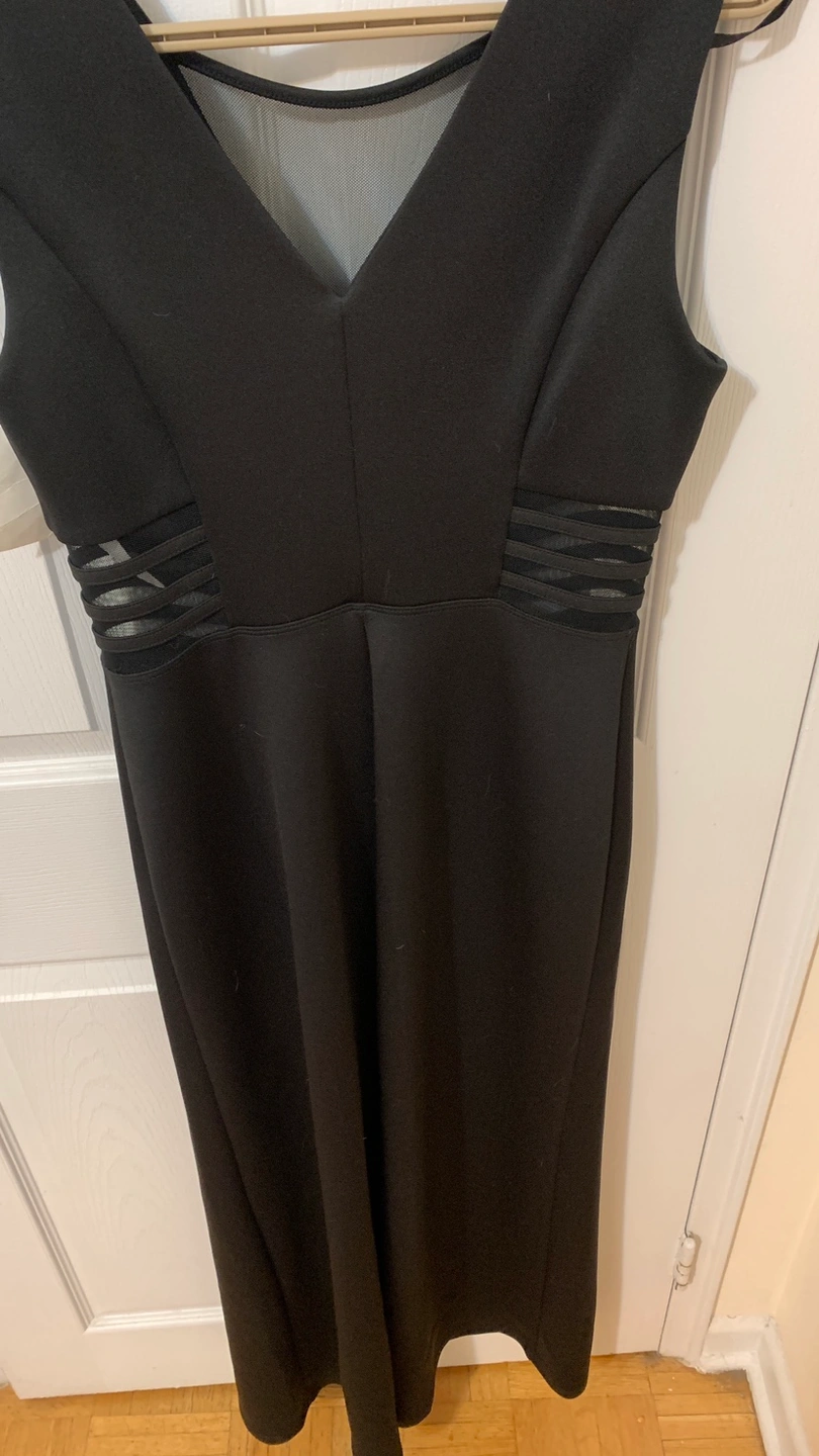 Black dress with mesh detailing. It has a V-neckline and a form-fitting silhouette. It is sleeveless and has a mid thigh slit up the front. Dress is form fitting and approx calf length. Never worn.