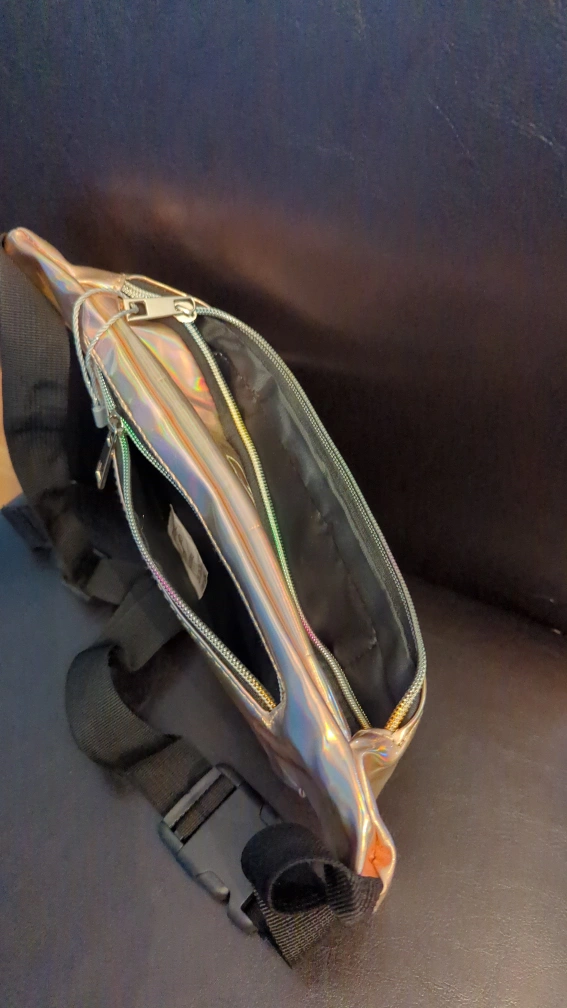 A holographic fanny pack with a black adjustable strap and black zipper pulls. It has the words "Style Happy" in black lettering on the front.