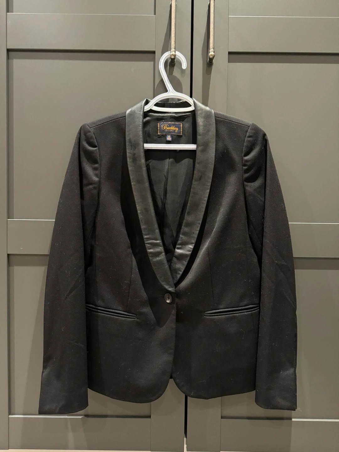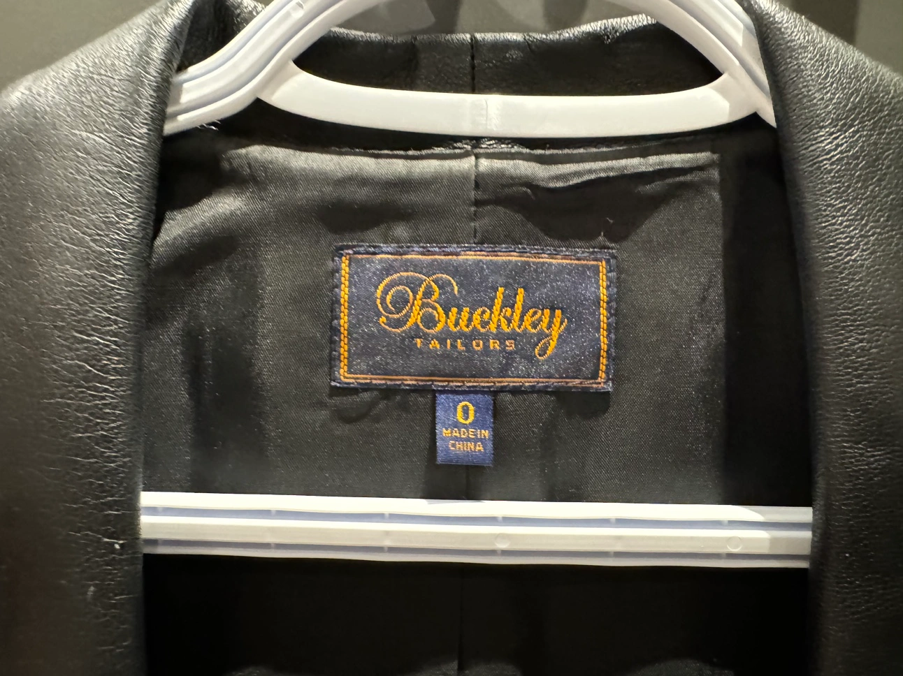 140Pick up at 16th Ave & Kennedy NE, Markham Madewell Black blazer with leather collar, size 0. Made by Buckley Tailors. The blazer is 54% polyester, 44% wool, and 2% spandex. The lining is 100% acetate. The blazer has two front pockets and one interior pocket. It has one button closure at the front. The blazer is in good condition. ***Accept cash only
