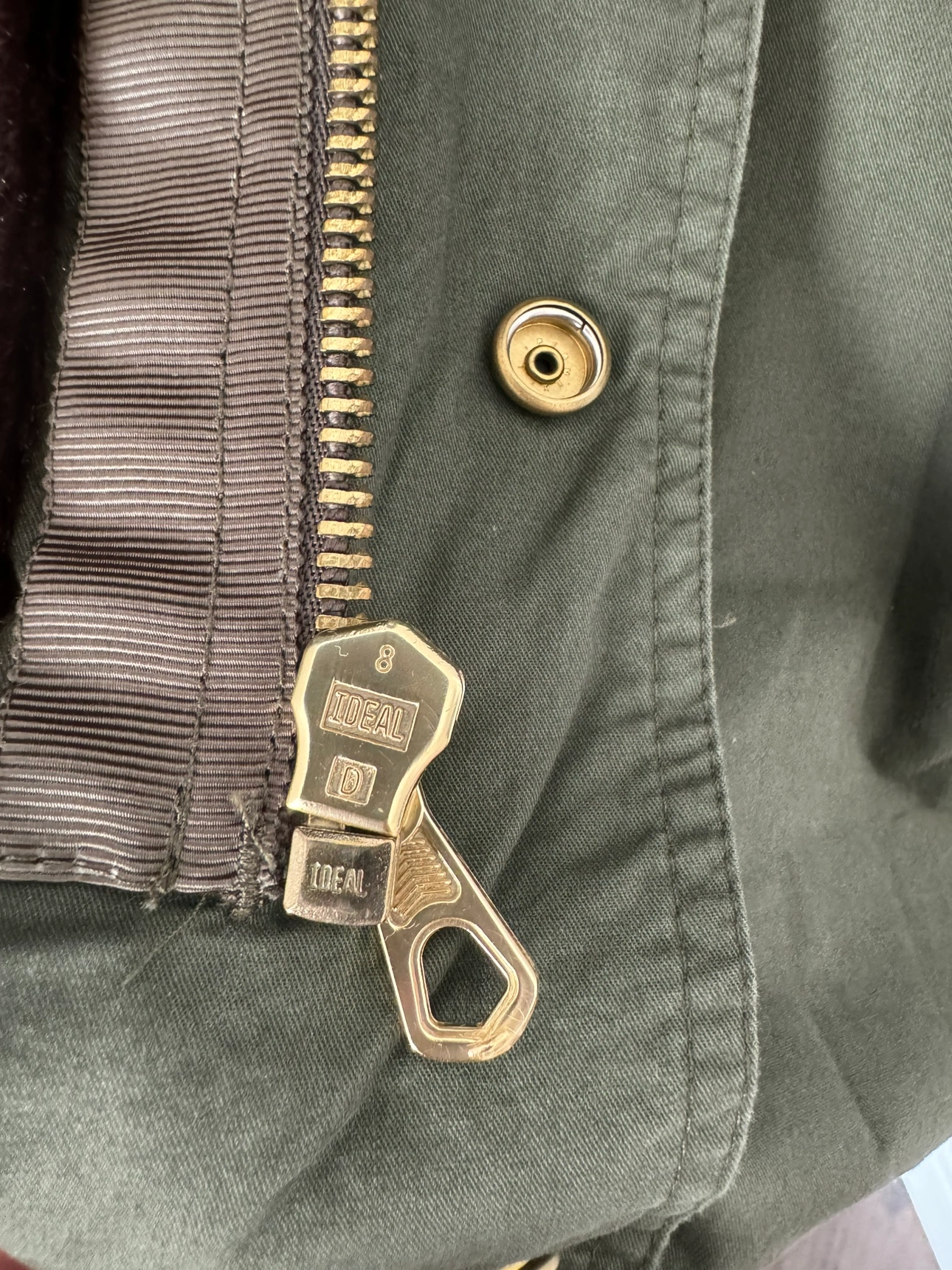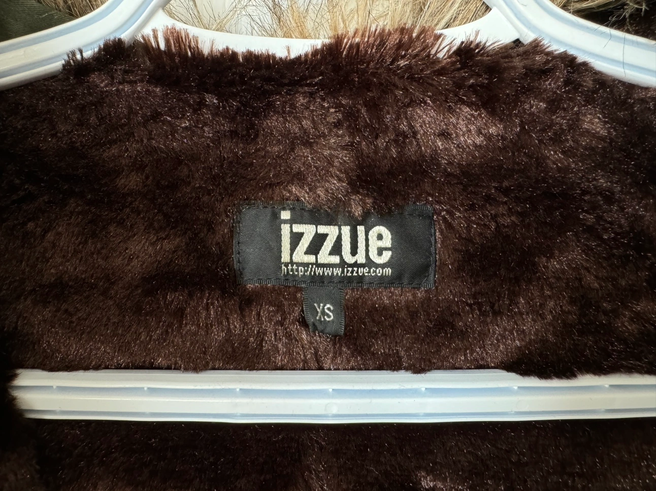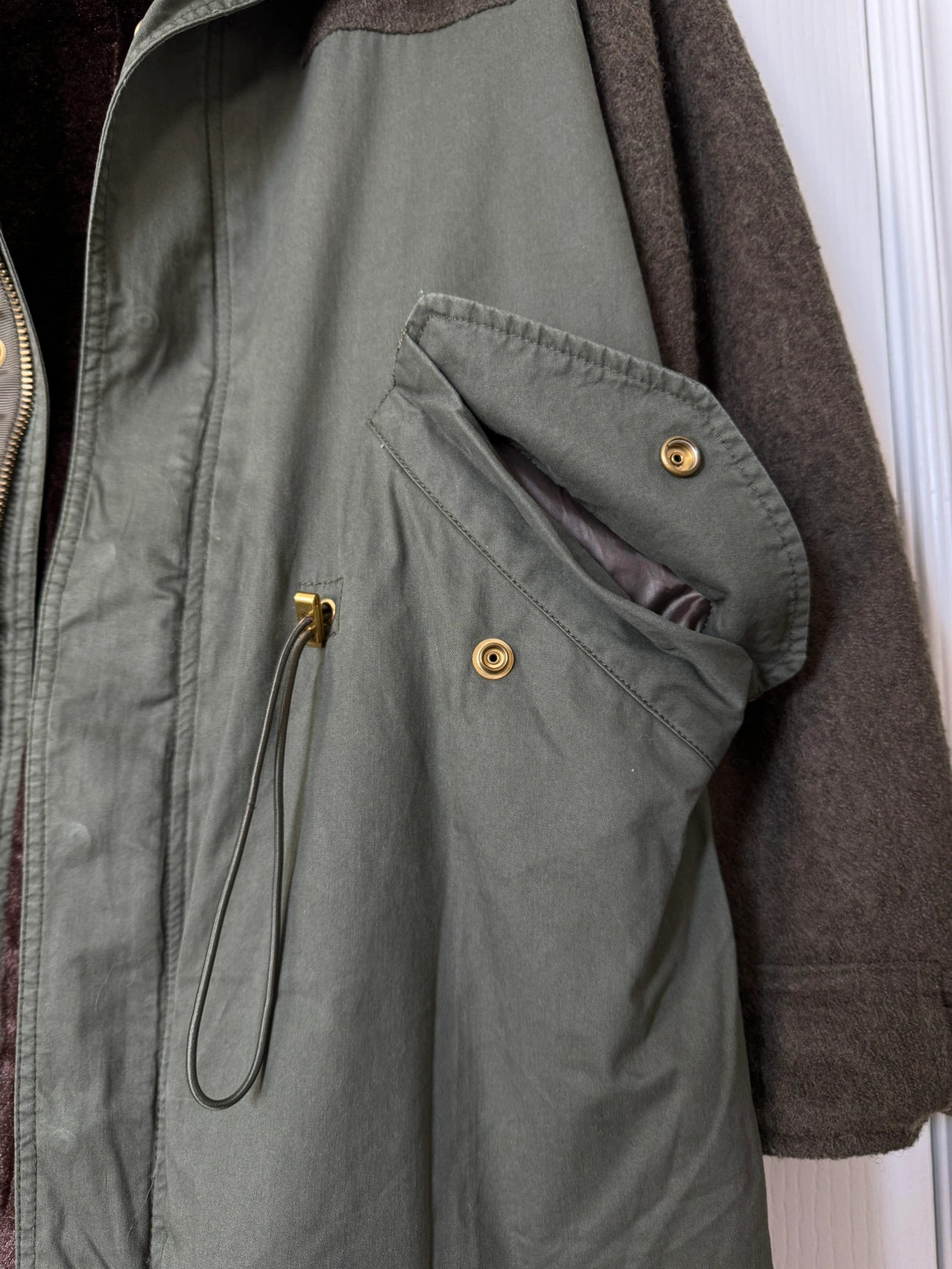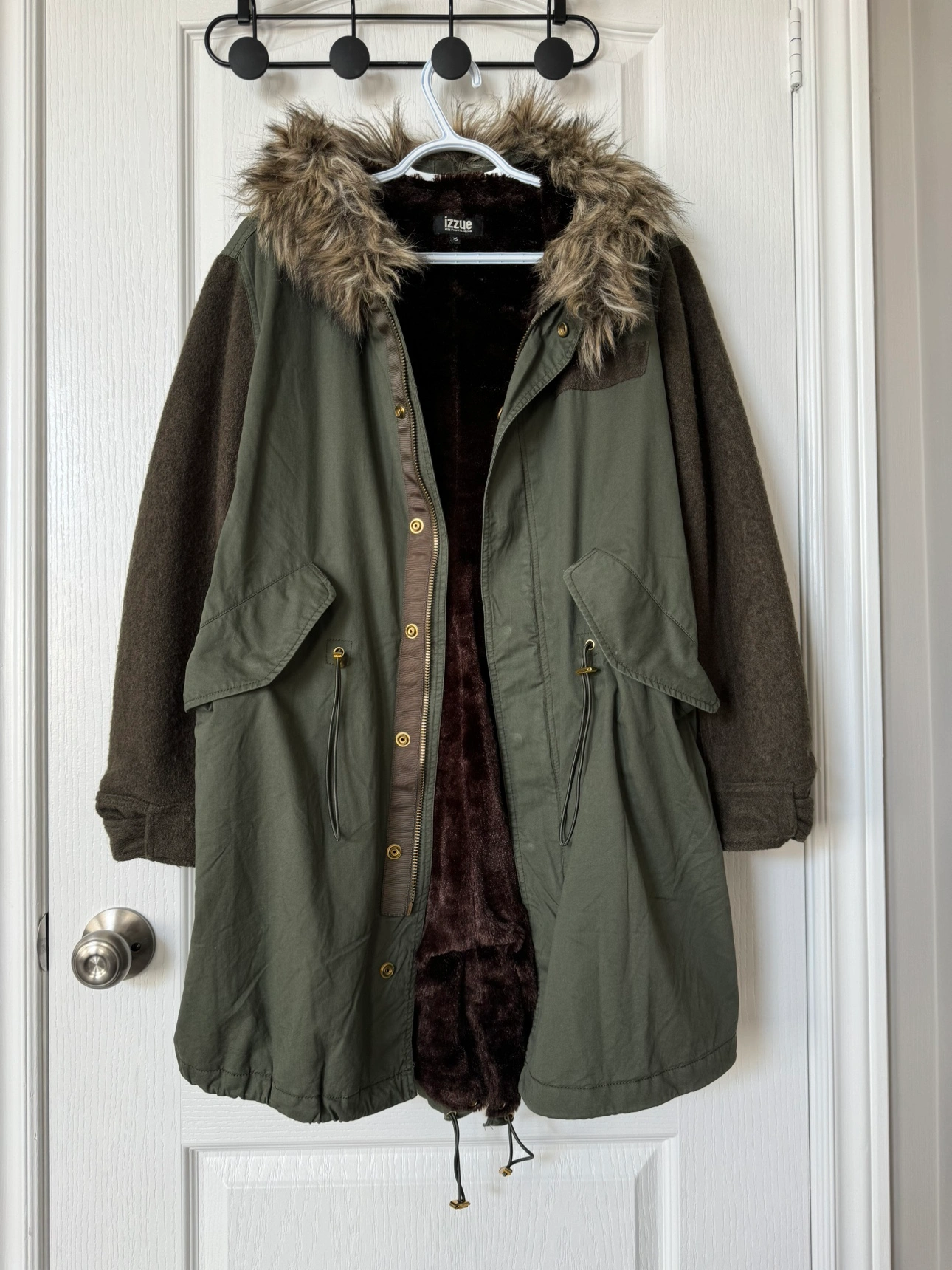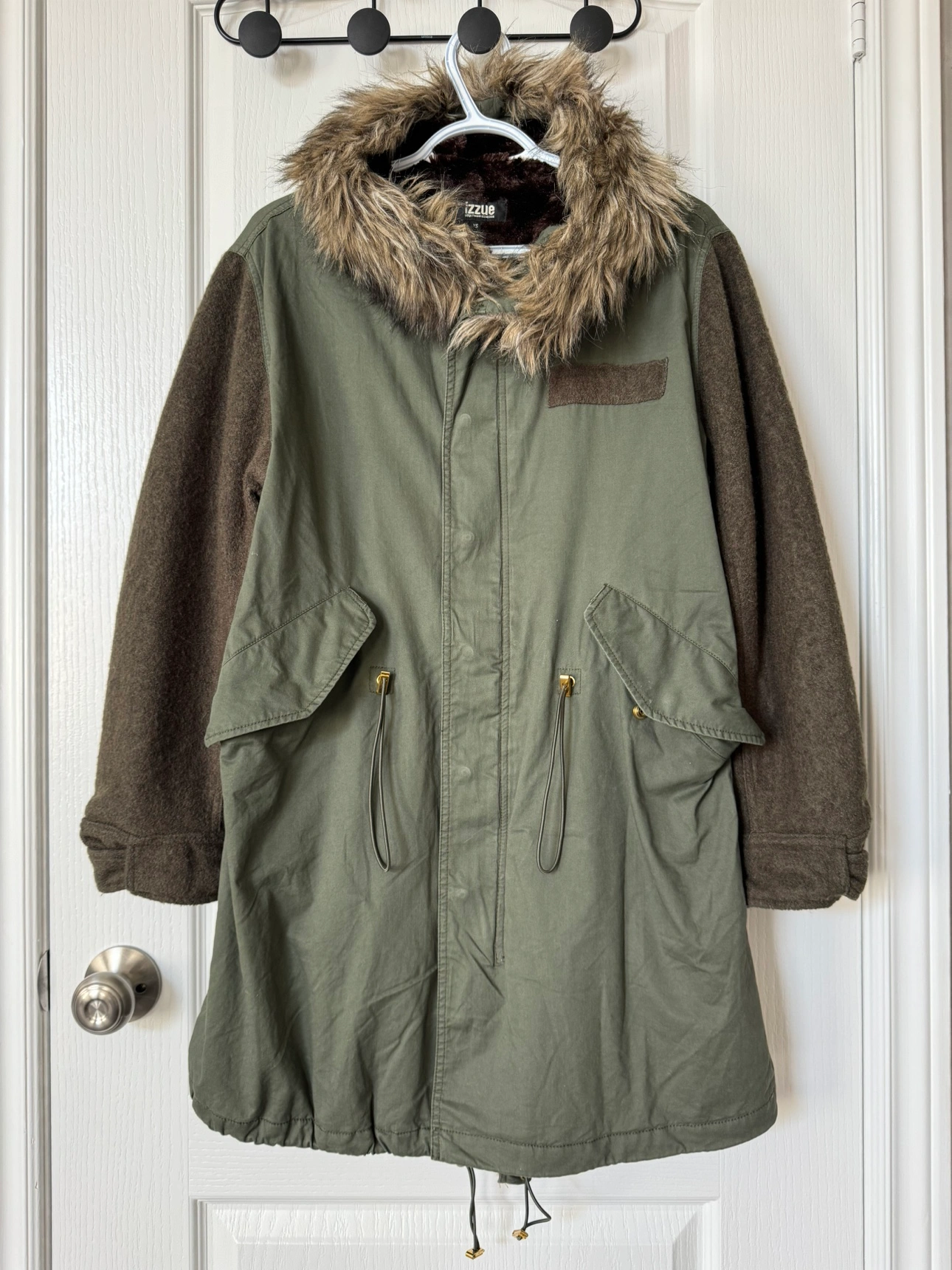 izzue Green winter parka with a faux fur hood and wool sleeves.