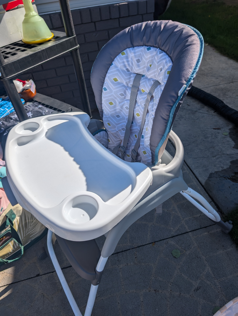 A baby high chair in good condition. It is a great option for feeding your little one. It has a removable tray with two cup holders. The seat is padded and features a five-point harness.