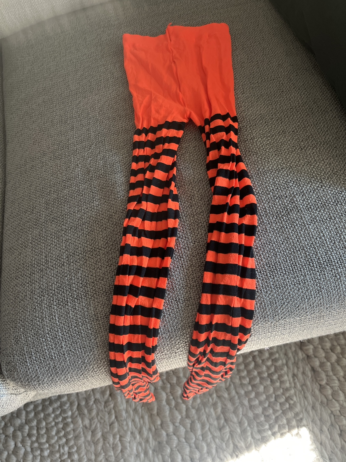 These tights are orange with black stripes. They are a great addition to any costume! My daughter wore them at age of 7. Might fit size 6-9 I imagine.