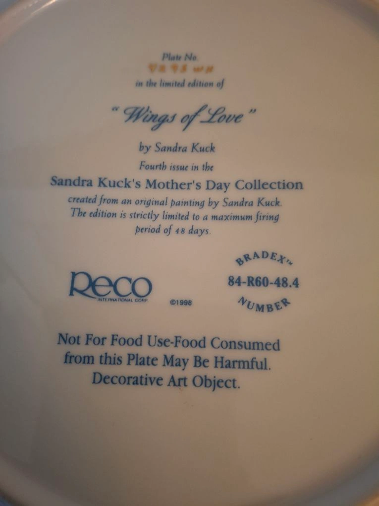 "Wings of love" decorative plate by Sandra Kuck. 9.5”, limited edition, 1998. Excellent condition. Does not include stand. Available for pickup in Markland Wood.