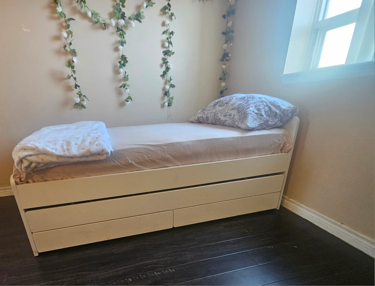 White Ikea single bed with storage drawers. and an extendable bed + 2 mattresses for both.