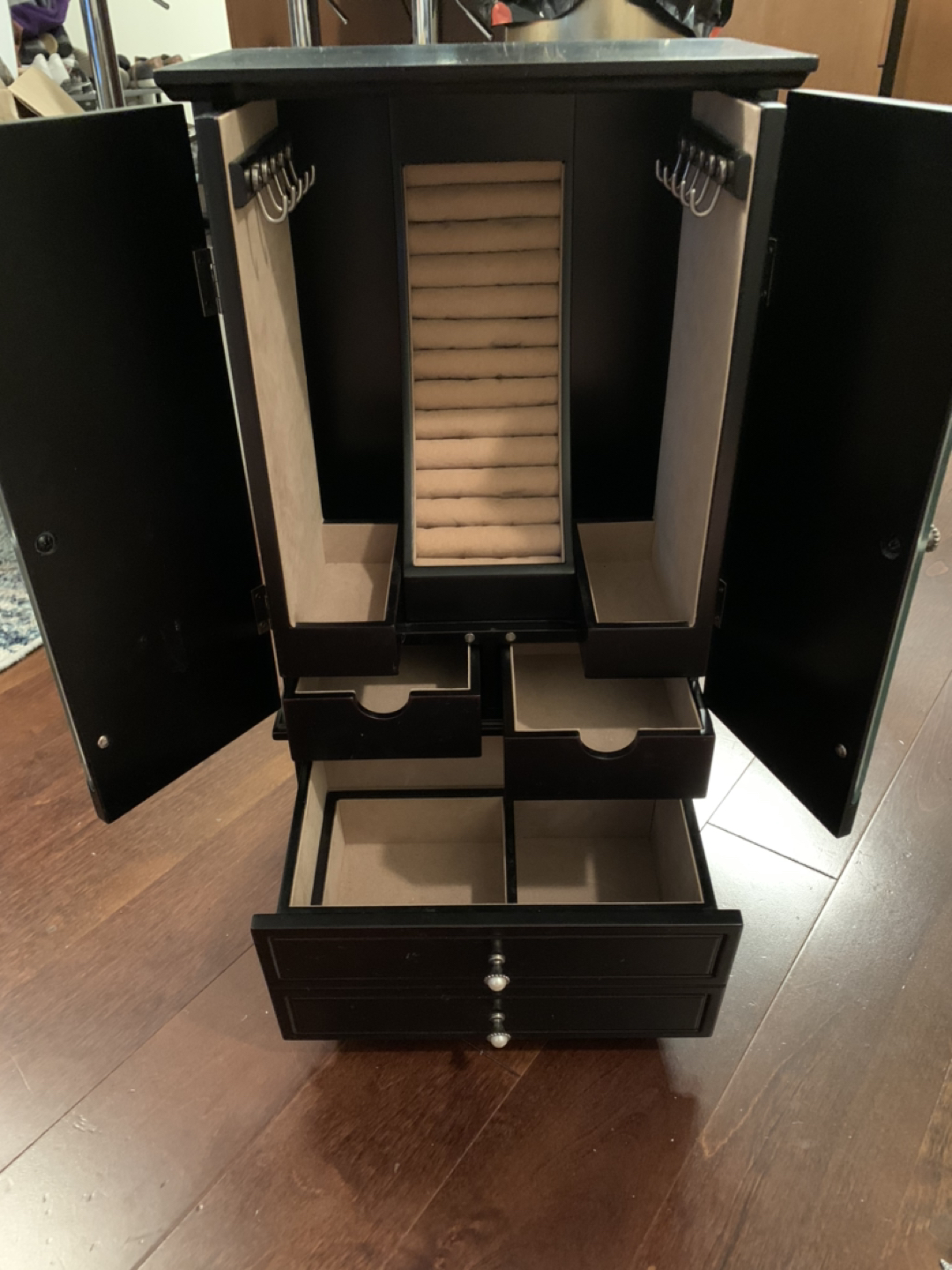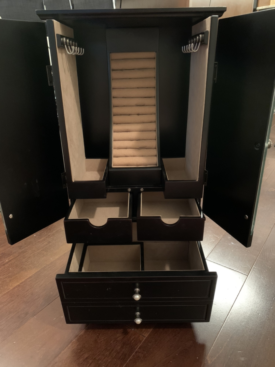 Holds a lot of jewelry - there are hooks to hang necklaces, a spot to insert rings, and many drawers as you can see from the pictures… fits all your necklaces, bracelets and rings and the mini jewelry cabinet looks good!!