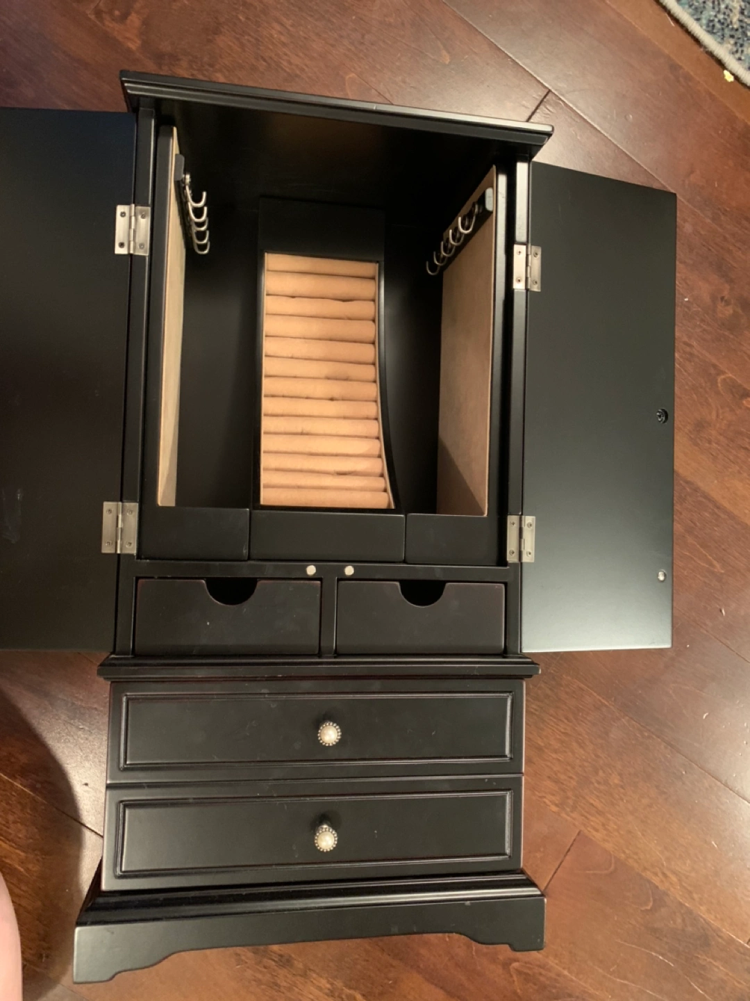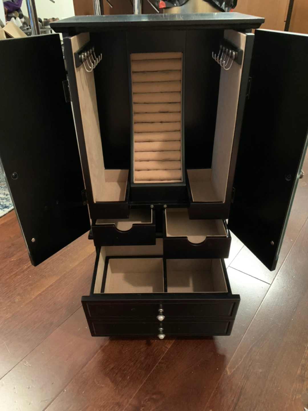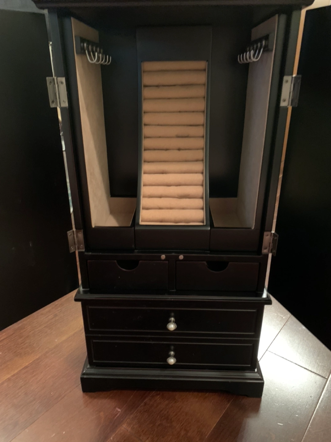 Holds a lot of jewelry - there are hooks to hang necklaces, a spot to insert rings, and many drawers as you can see from the pictures… fits all your necklaces, bracelets and rings and the mini jewelry cabinet looks good!!