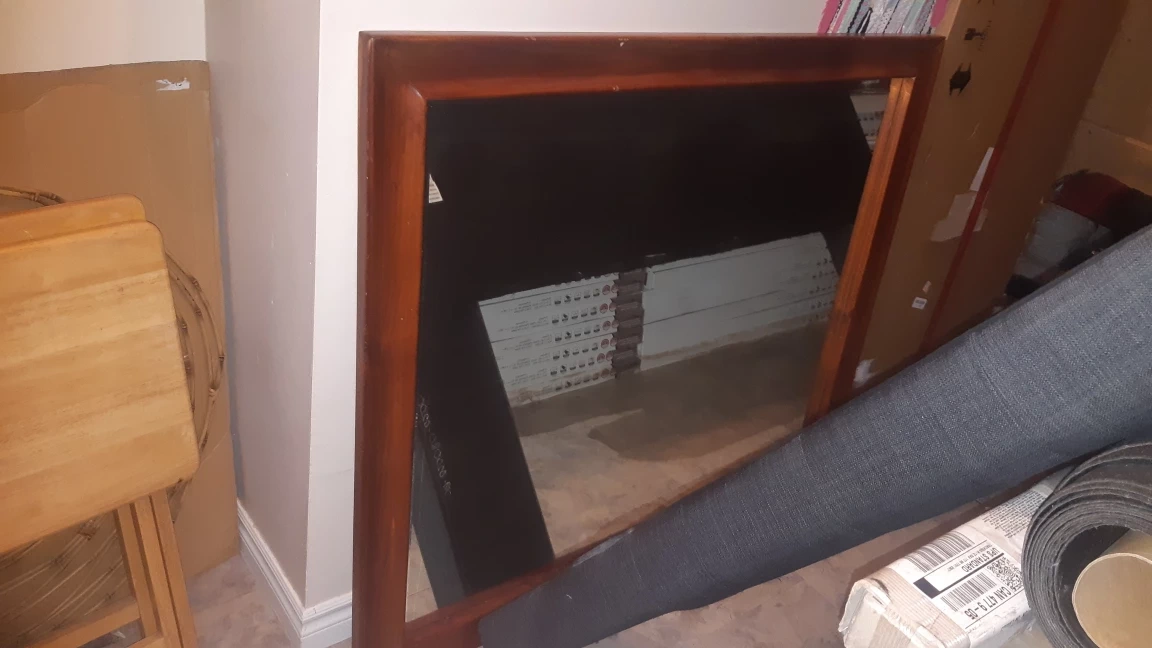 A large mirror with a wooden frame. The mirror is in good condition and is ready for your home. It measures approximately 40in. wide and 46tall. It has a thick brown wooden frame. It would be perfect for a hallway, living room or bedroom. It is great for adding light and space to your room. The mirror is also a great way to add a touch of elegance to your home decor. it is heaving and was used to put on a front entrance table.
