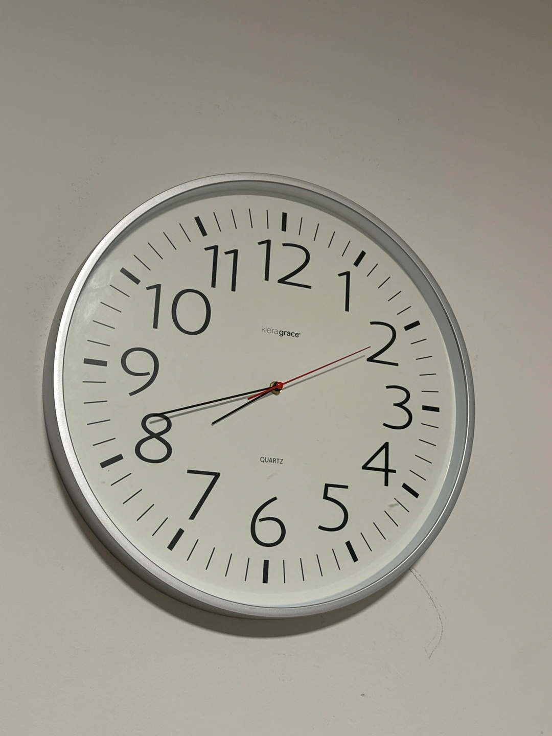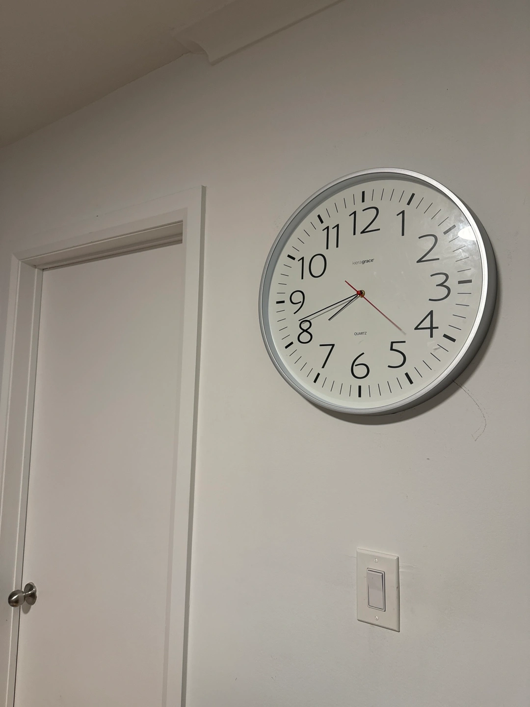 550Silver framed clock with black and red hands. It is a quartz clock, quite big as you can see in the pics as attached next to the door. No marks or scratches- just a little dusty. Cash only Pickup only