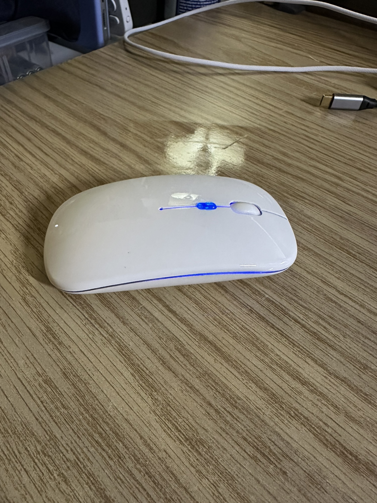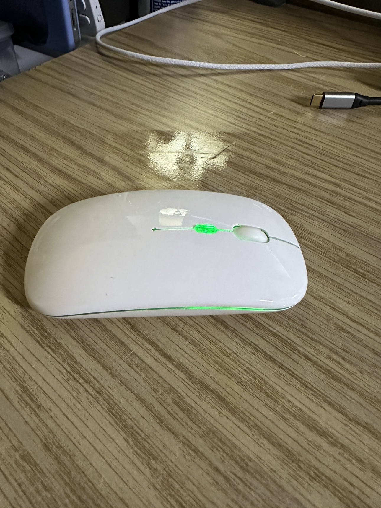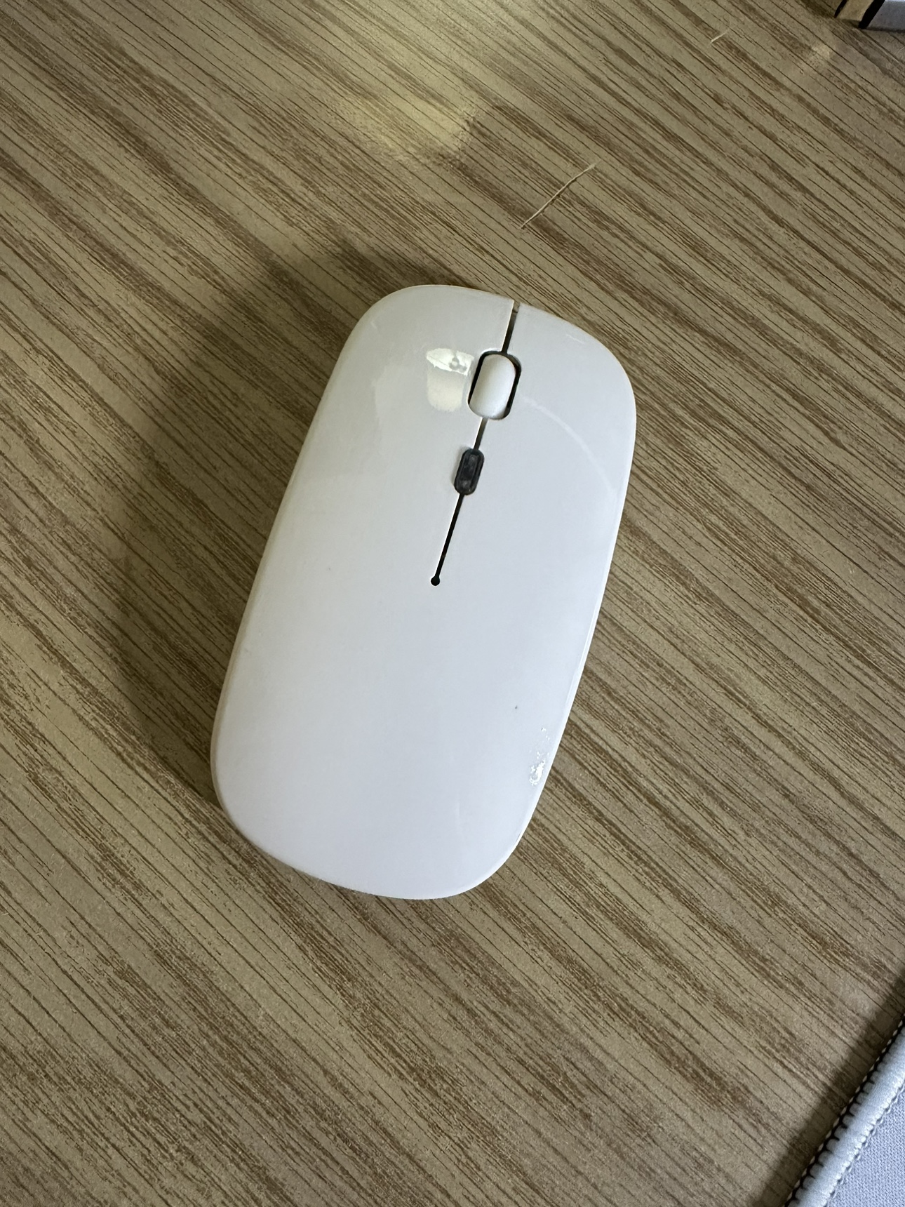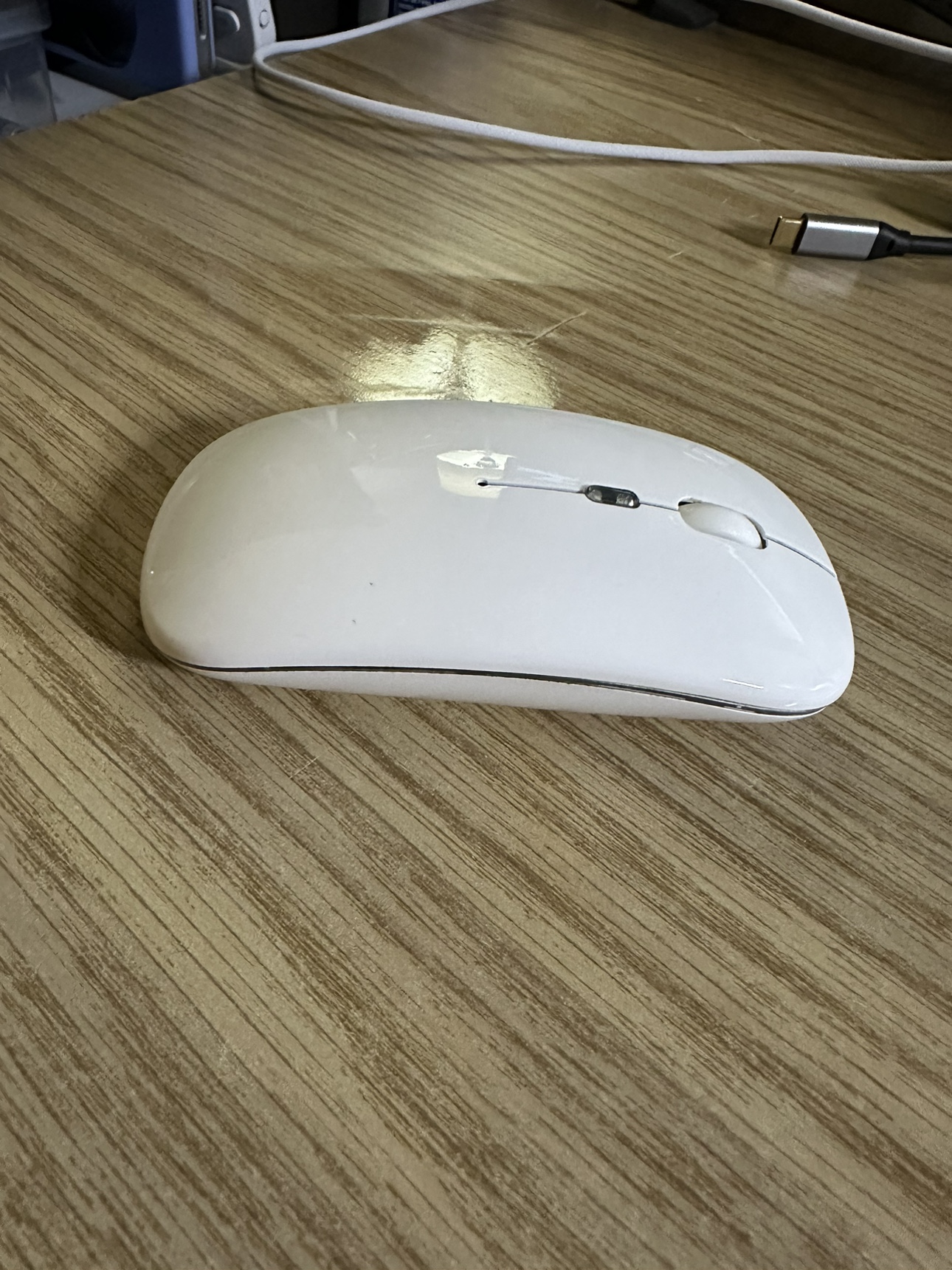 White wireless computer mouse with a USB receiver, and can be used wirelessly (usb) or connected to Bluetooth.