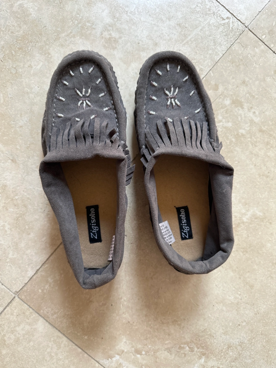 Grey moccasin slippers with beaded detail and fringe. Never worn, just tried on.
