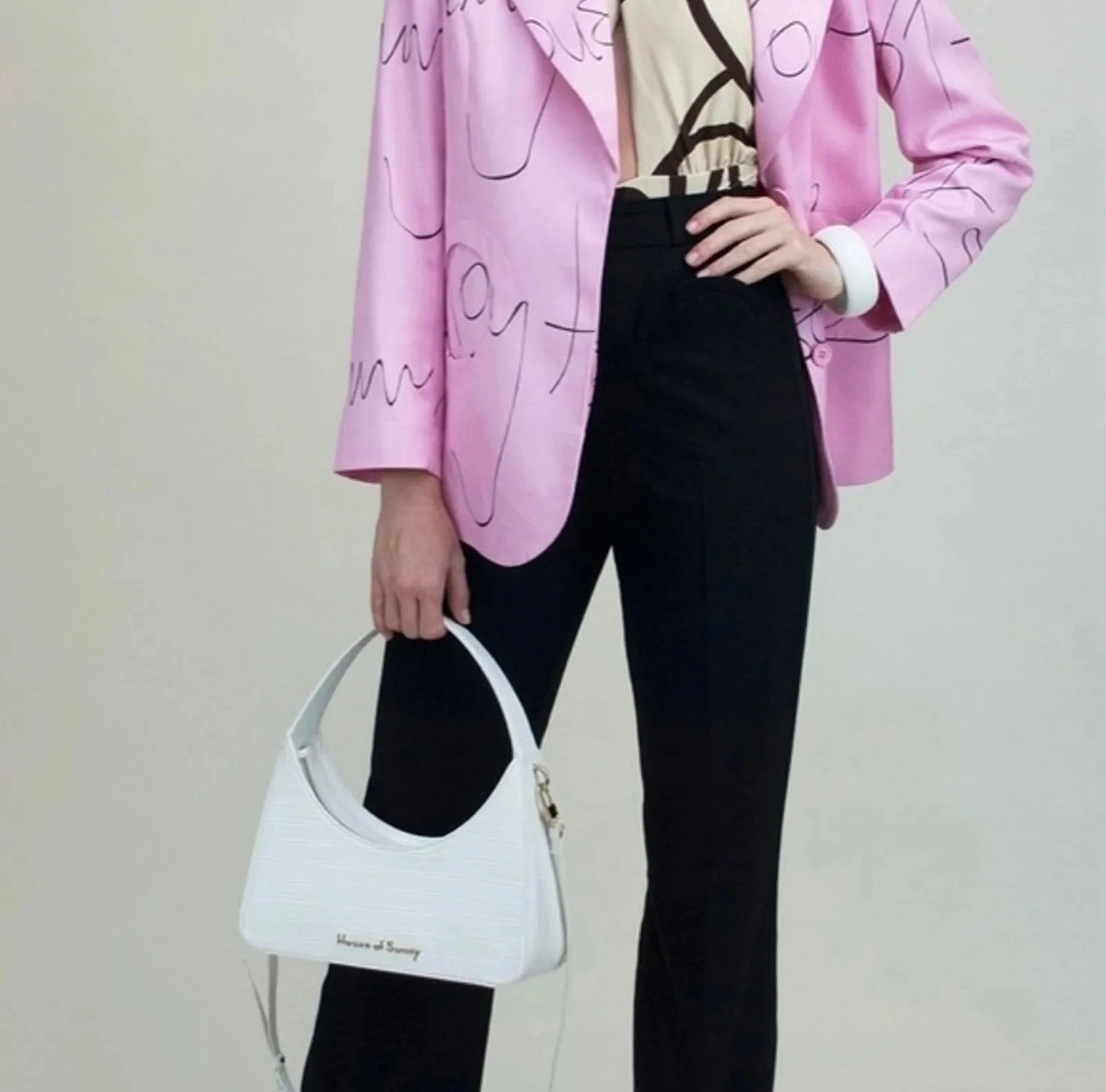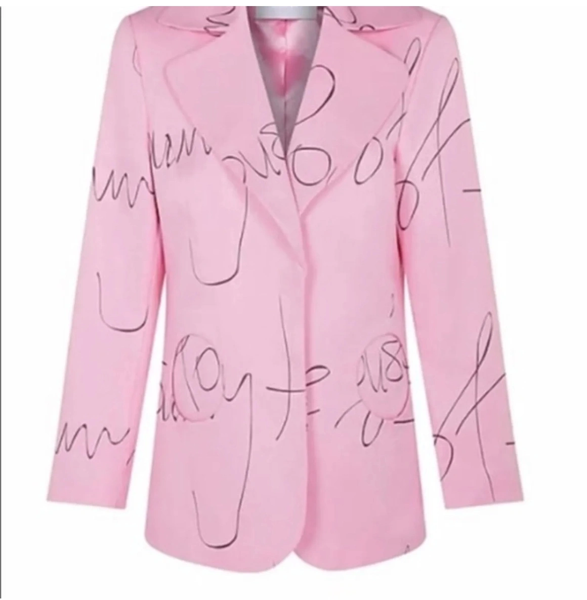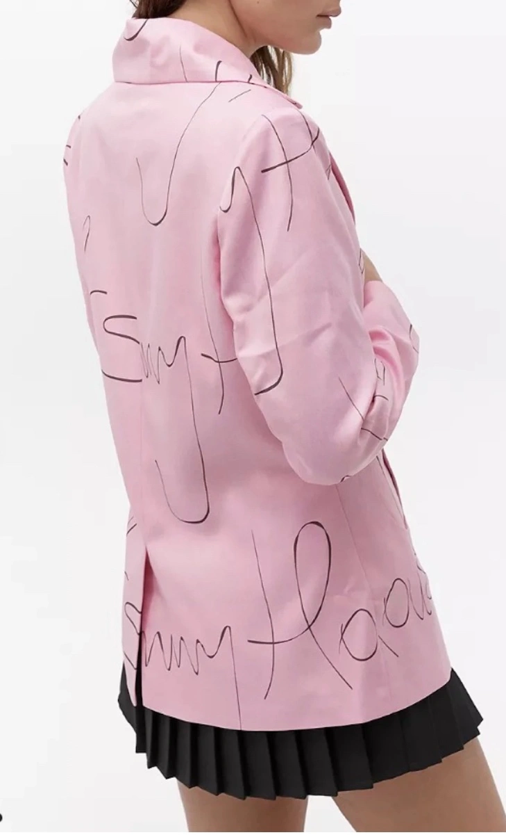 73Boxy 80's style blazer in a vibrant pink with hand written logo. We have chosen not to use placement print on this blazer, saving up to 40% of wasted fabric. This does mean each blazers' print will be placed differently.