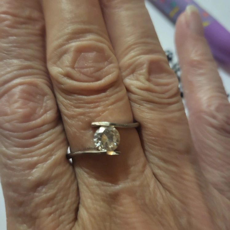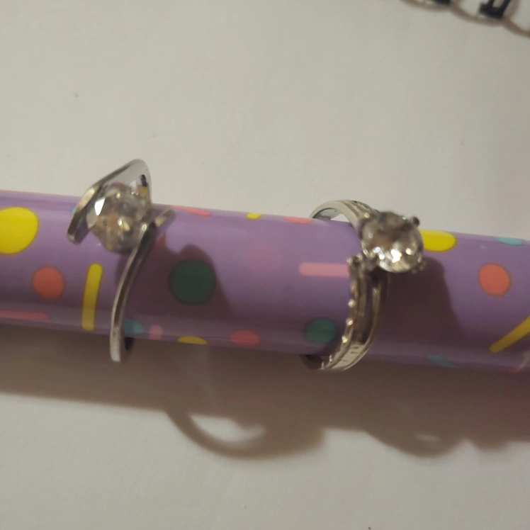 Two silver tone rings with a large clear stone. One is about size 8, and the other is close to a size 6. There are three bands. The one in the middle goes around the large stone.