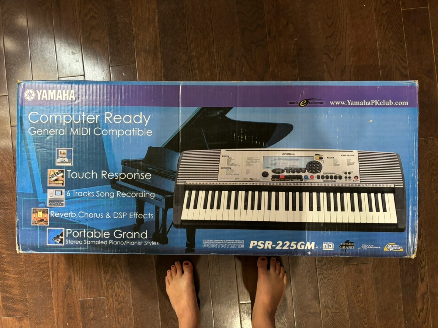 Yamaha PSR225GM Digital key board. 36 touch sensitive keys. Not weighted though. Good for kids and comes with a simple stand and attachable sheet music tray. This is an old key board but still works so far!