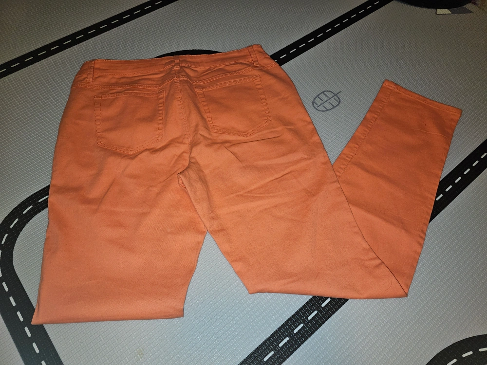 Coral coloured straight fit pants.