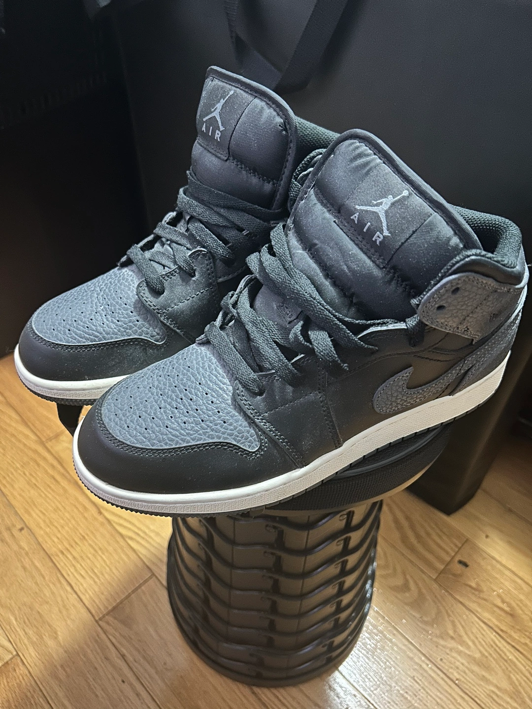 Black and grey Air Jordan 1 Mid shoes. The shoes have a black upper and a grey suede toe box. They have a white midsole and a black outsole. The shoes are in great condition. Only worn a few times