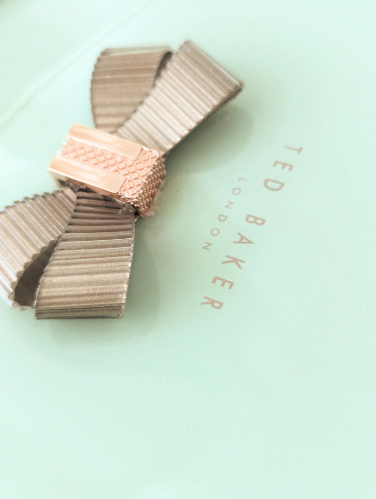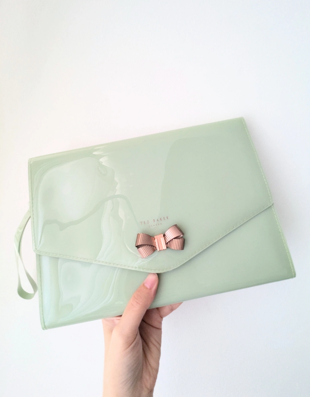 A soft sage green Ted Baker envelope clutch with a rose gold bow and hardware. There is a small wrist strap that is removable. Gently used with no wear and scratches.