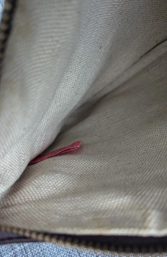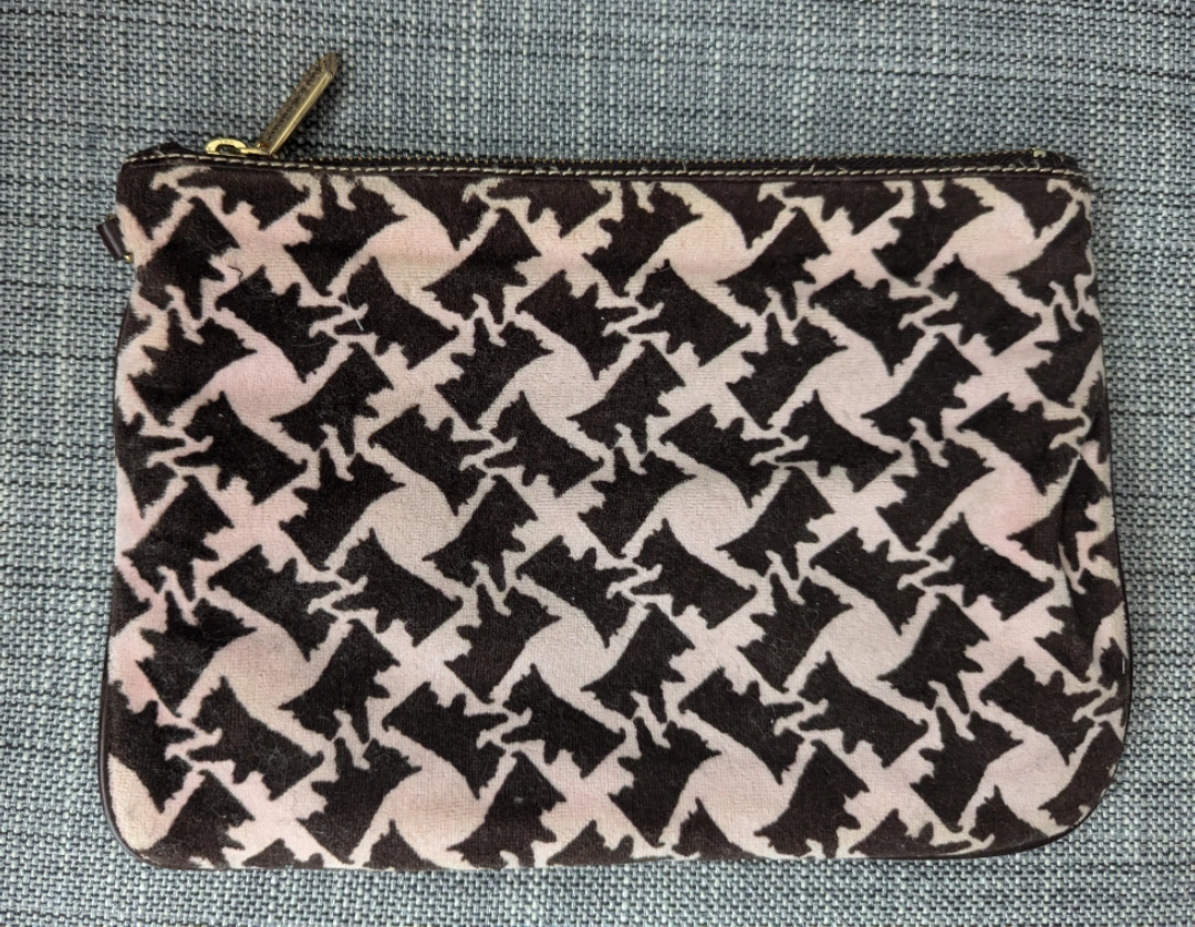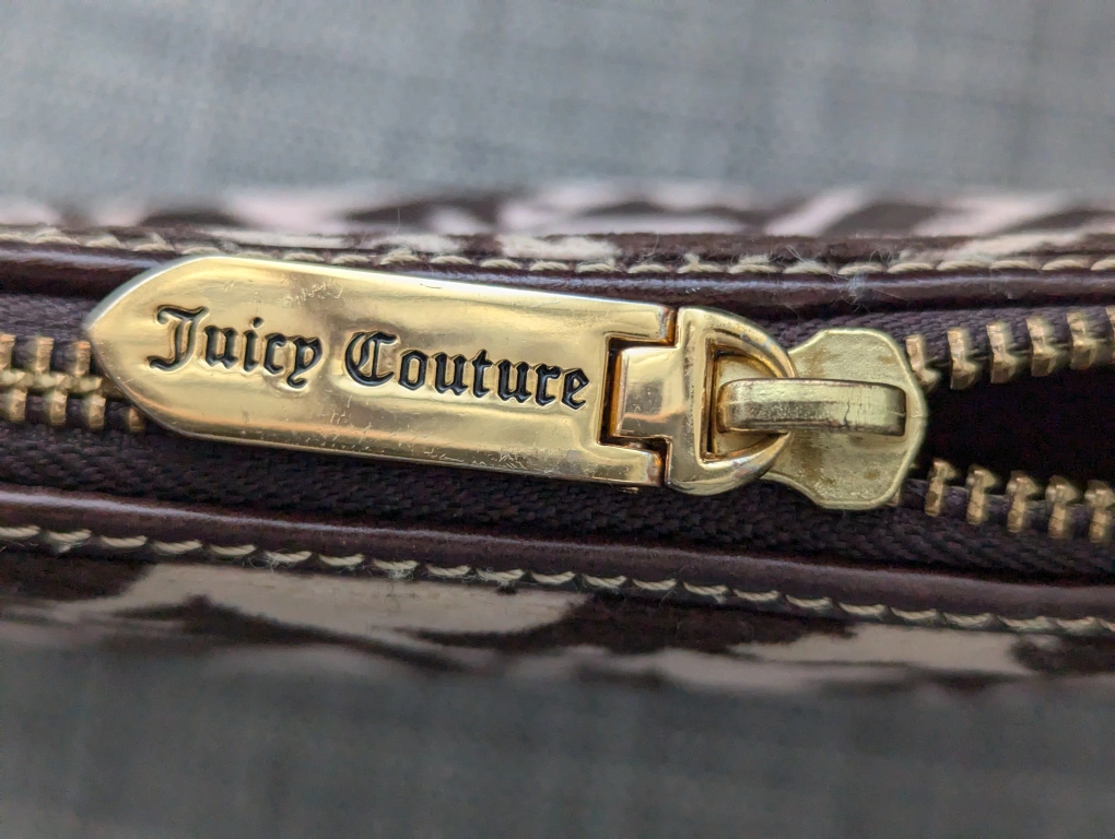 Juicy Couture velvet pouch with brown and pink pattern and gold zipper closure. Has a small ring on the side for charms or wrist strap attachment.
