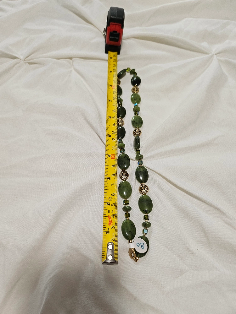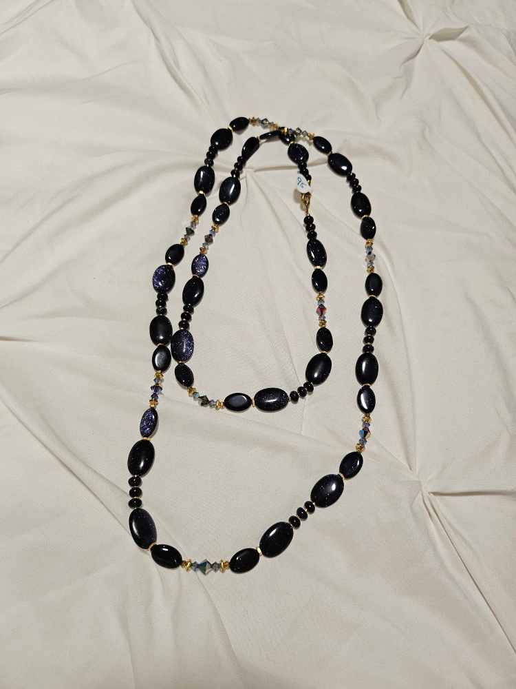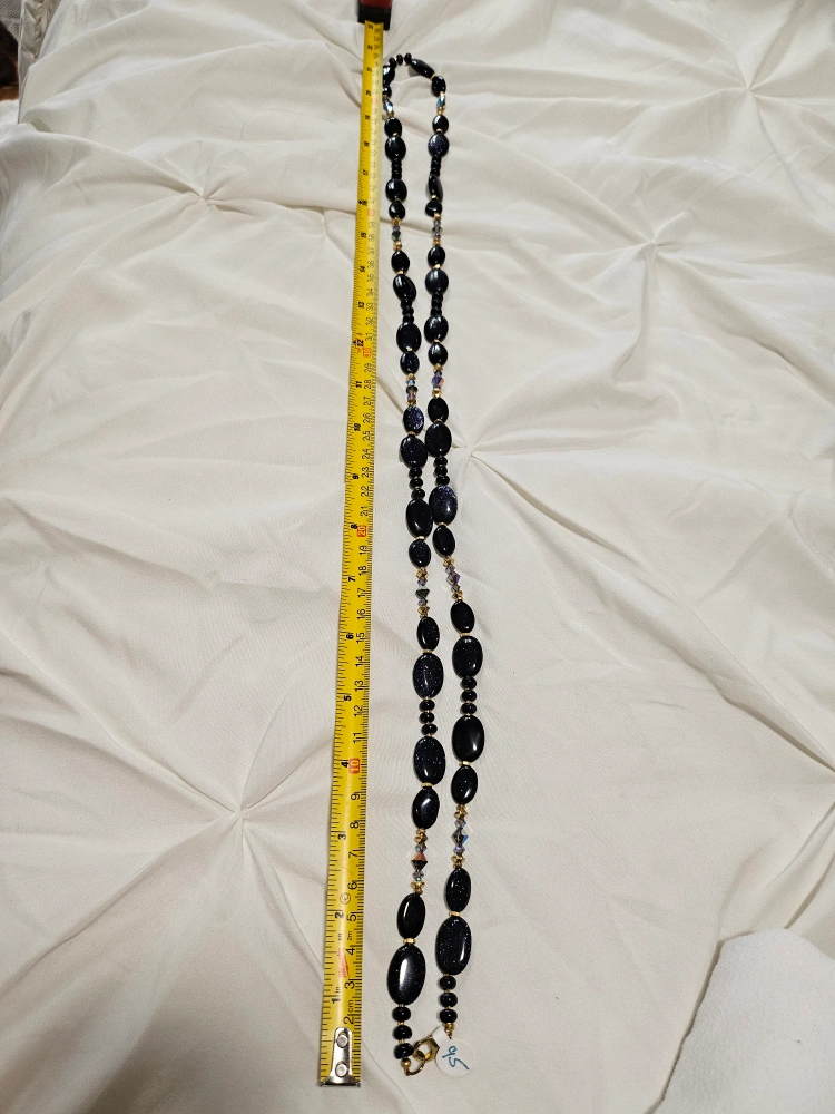 Two long beaded necklaces, one black and one green. The black one is approximately 24 inches long and the green one is approximately 20 inches long. They are both made with oval beads, gold spacers and small crystal beads. Got it as a present 🎁 but it ended up just keeping in my jewelry box .