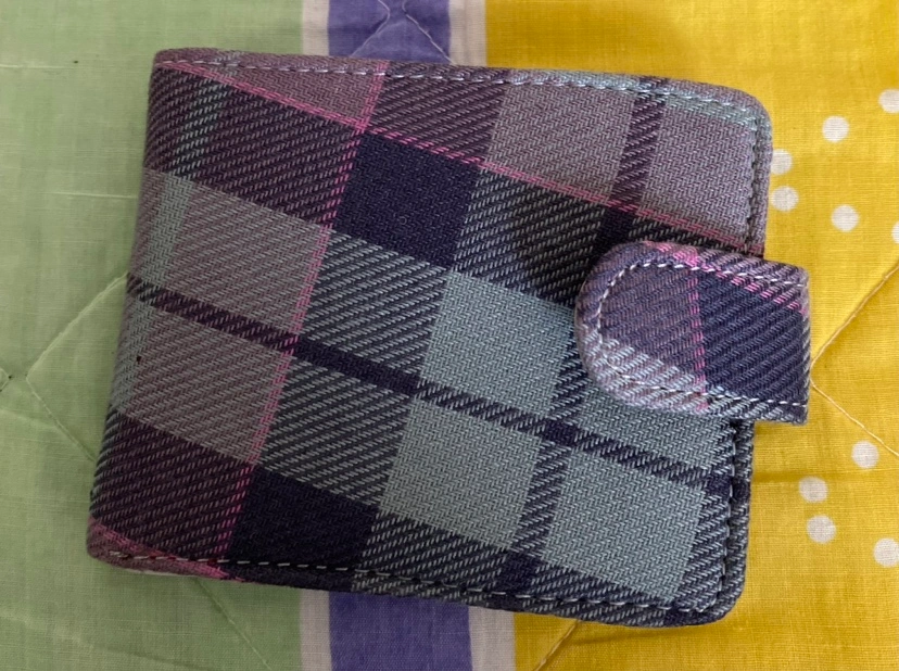 A small wallet with a tartan patterned exterior and a grey interior. It has two compartments for cards and a small pocket for cash.