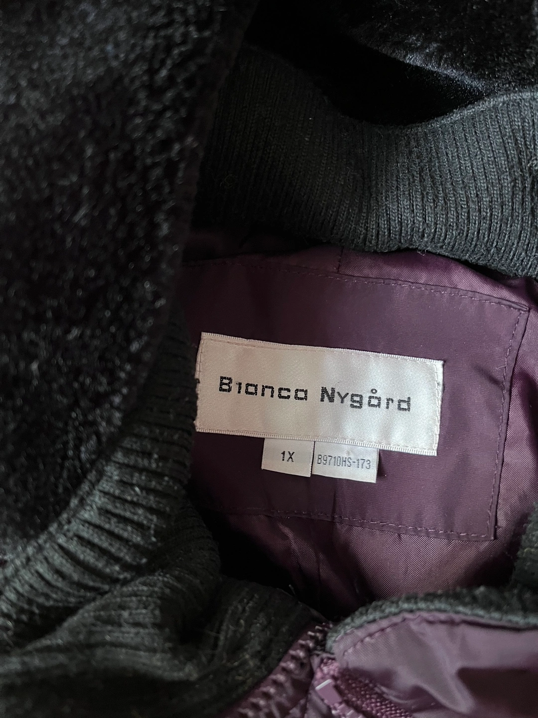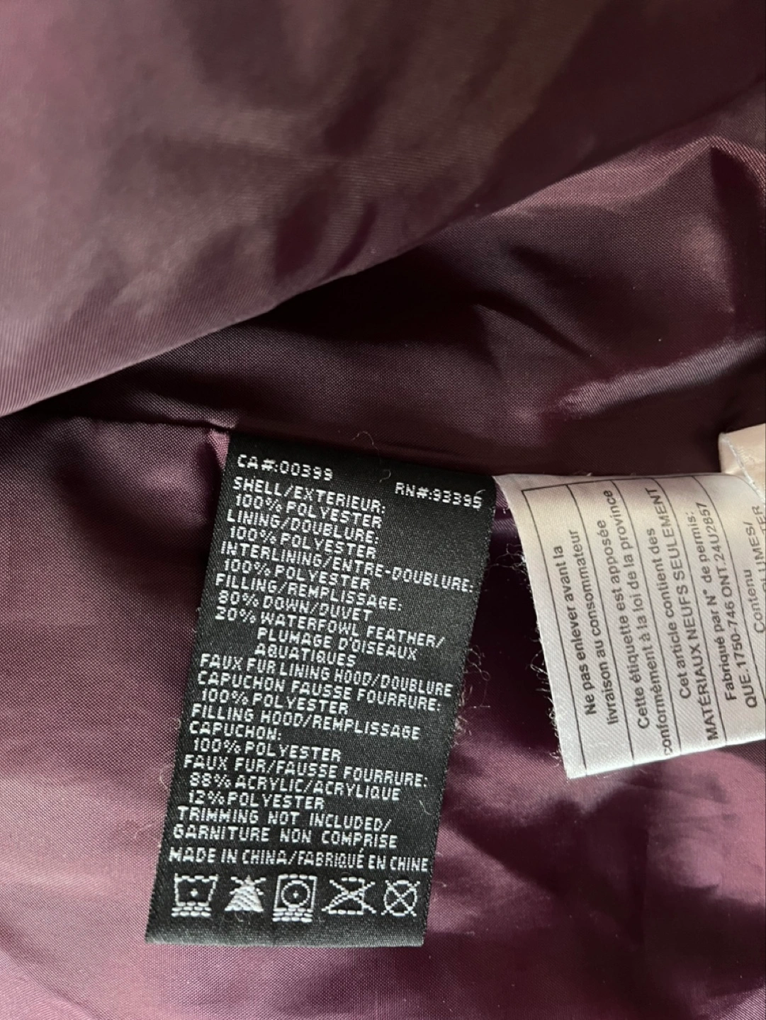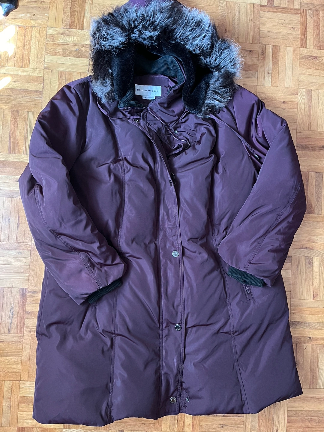🟣Dark Purple down filled winter coat with a faux fur lined removable hood and a zipper closure.